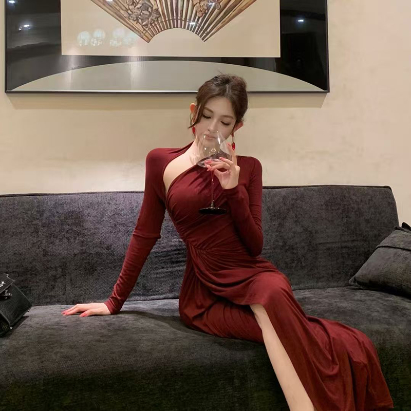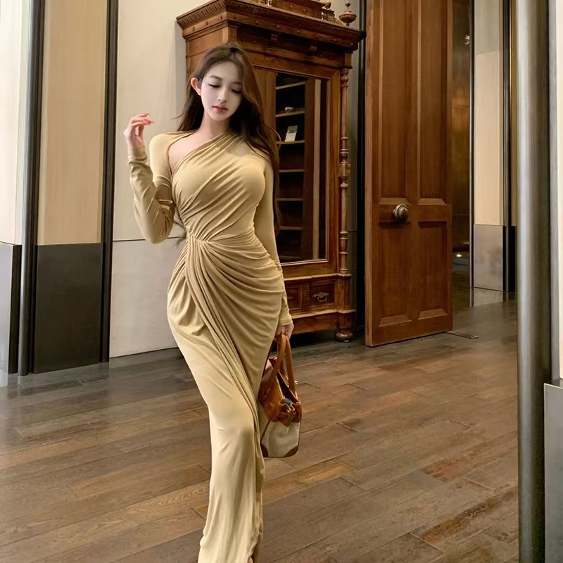 YF7211-(2色入内)名媛气质褶折镂空套头扭纹收腰交叉性感弹力包臀显瘦礼服裙子