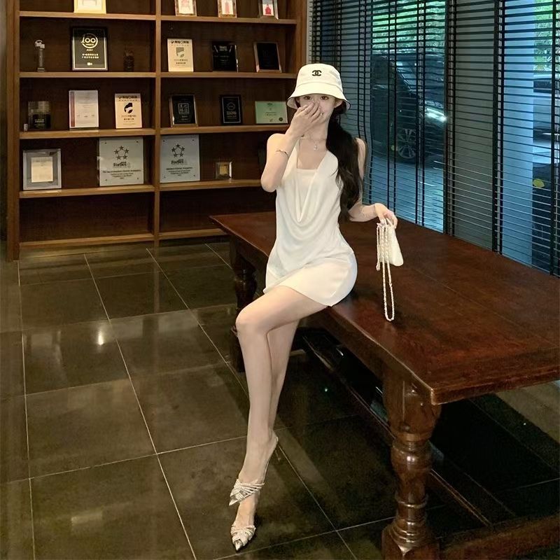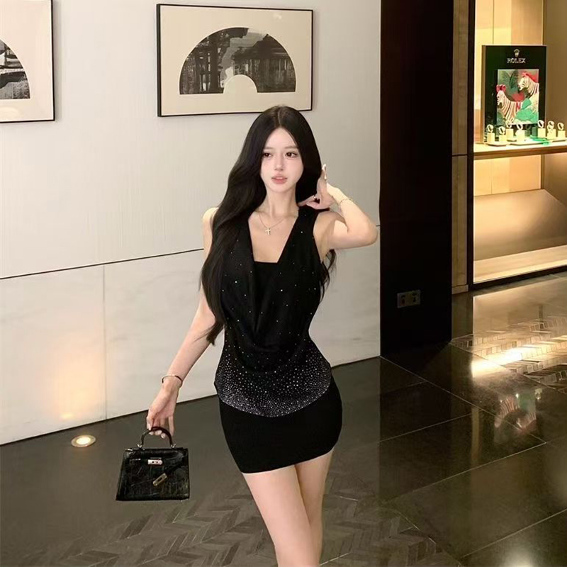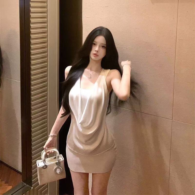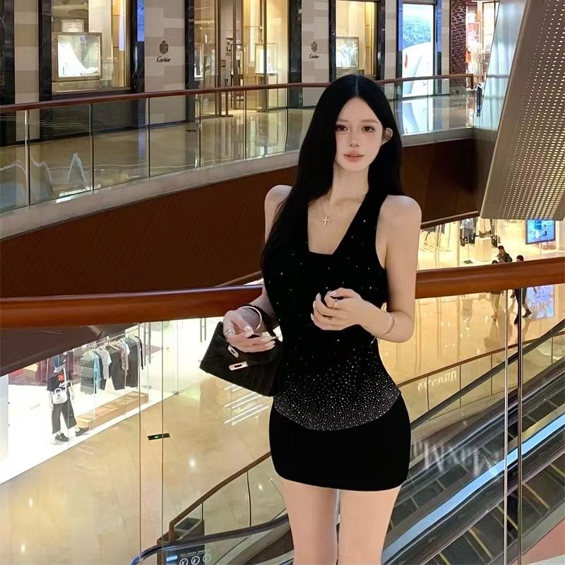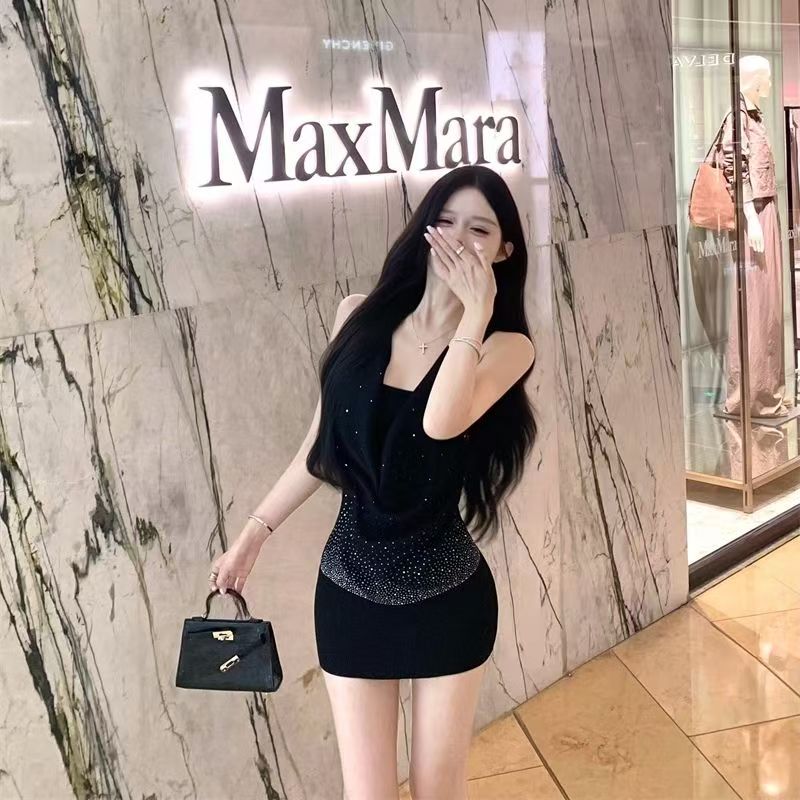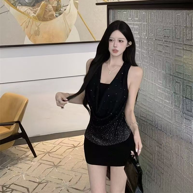 YF7212-(2色入内)夏季轻奢烫钻无袖吊带堆领显瘦性感包臀纯欲风连衣裙