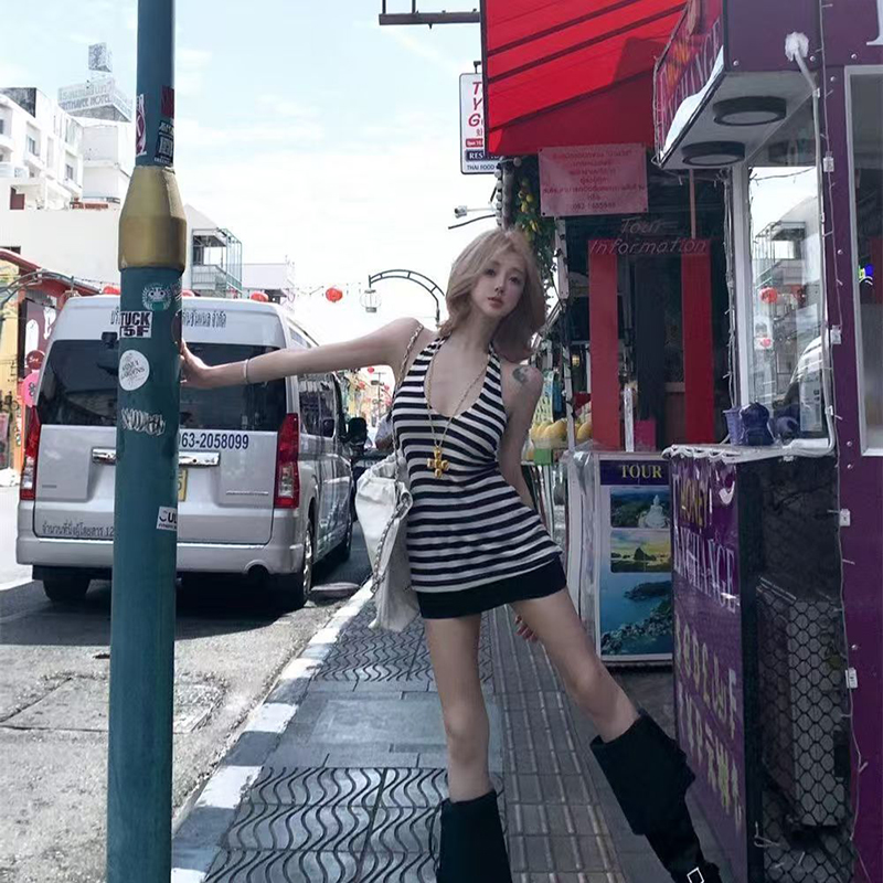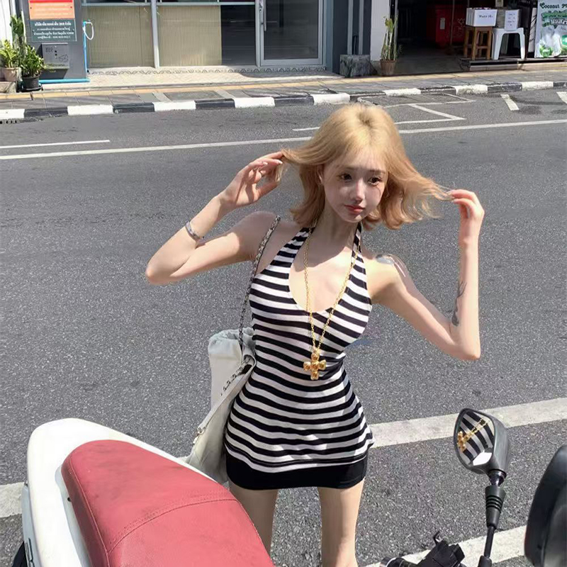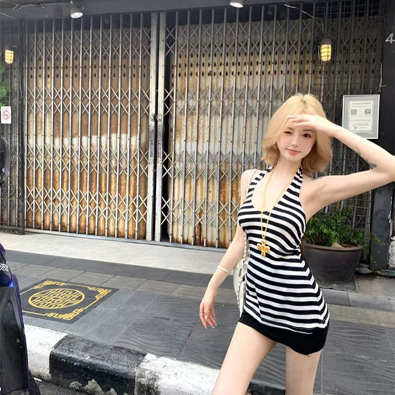 YF7215-图片色时尚夏天挂脖露背黑白条纹弹力显瘦辣妹外穿新款上衣