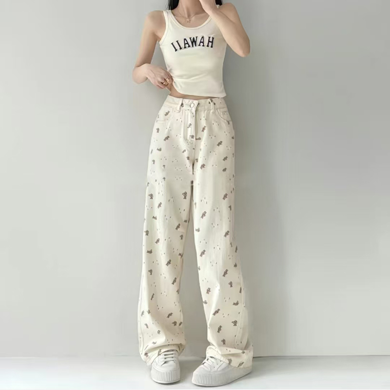 YF7216-图片色超便宜时尚小熊印花高腰直筒坠地感白色时尚牛仔裤