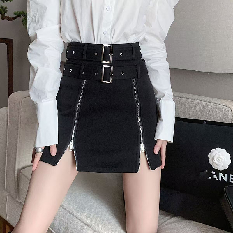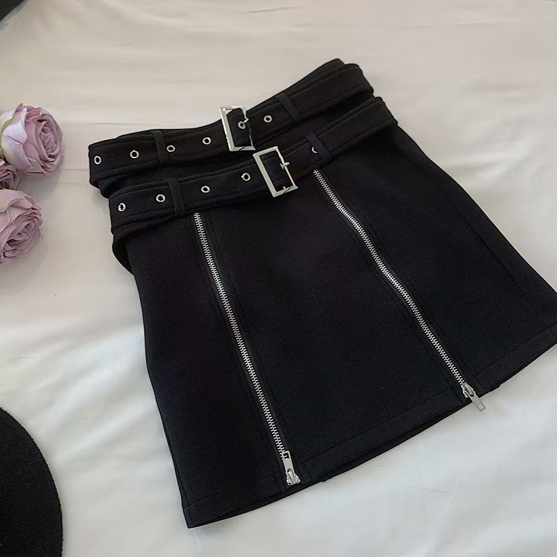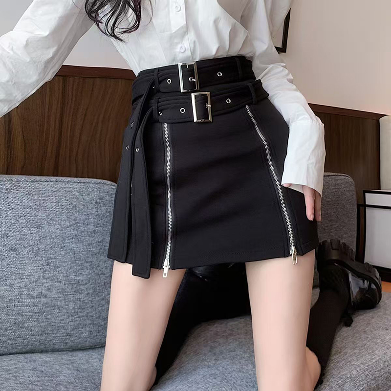 YF7217-图片色韩版双排扣拉链A字黑色纯欲风设计感辣妹新款复古气质A字裙