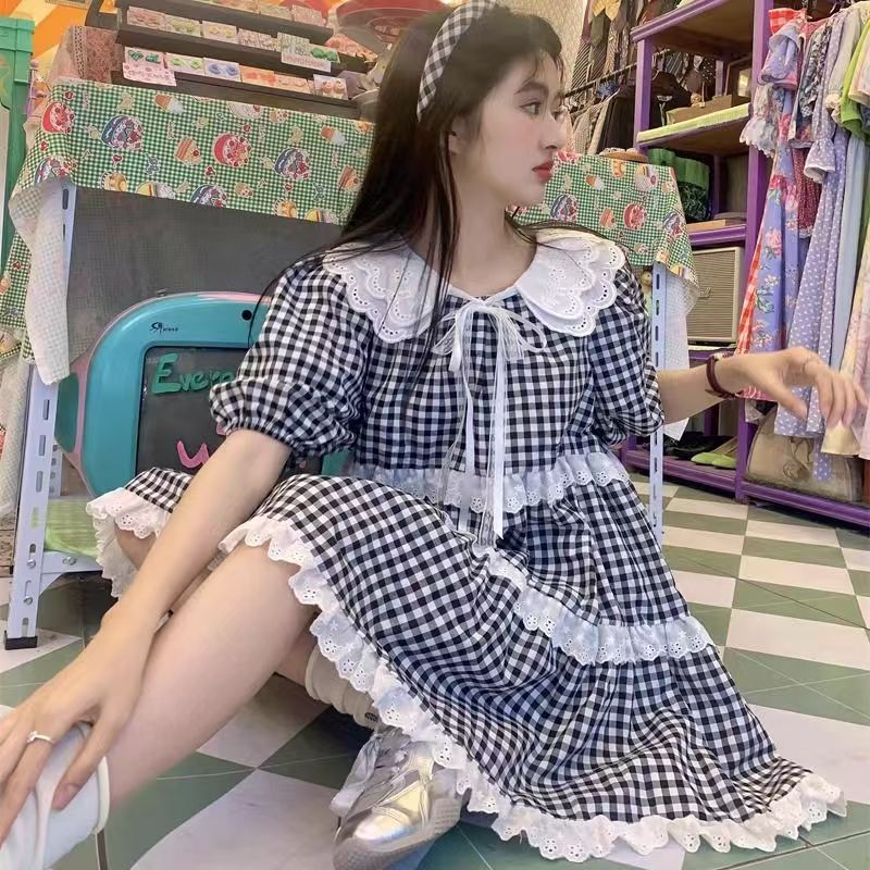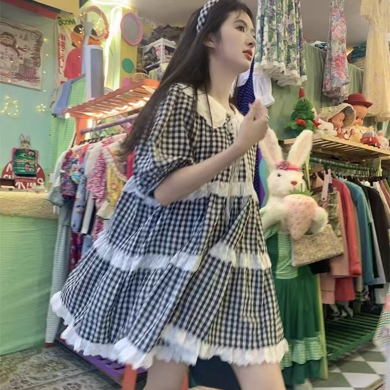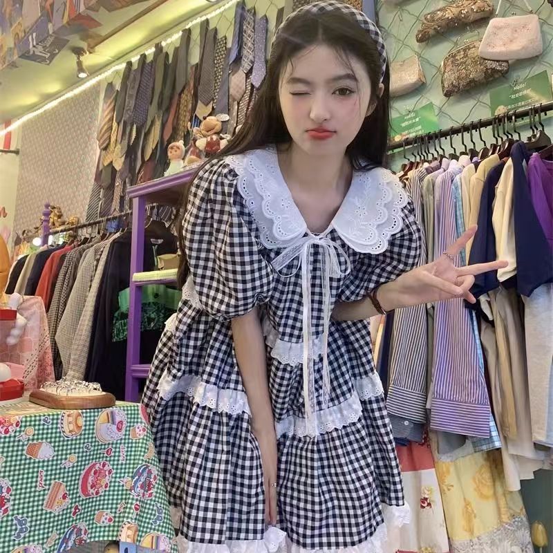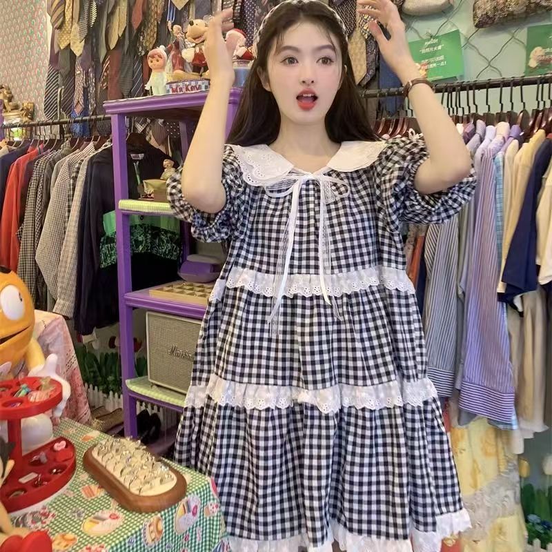 YF7219-图片色甜美时尚娃娃领系蝴蝶结蕾丝拼接短袖宽松显瘦格子大码连衣裙