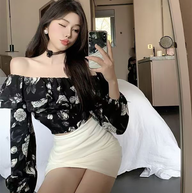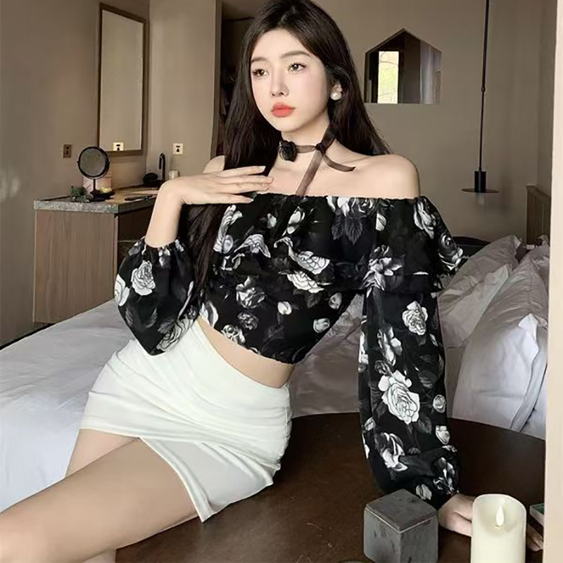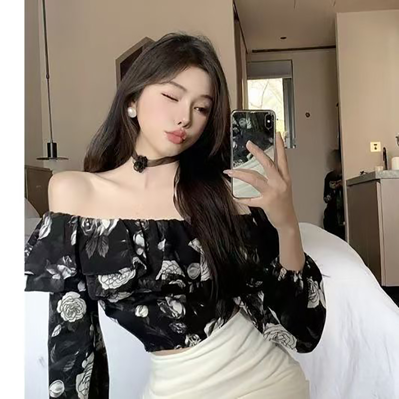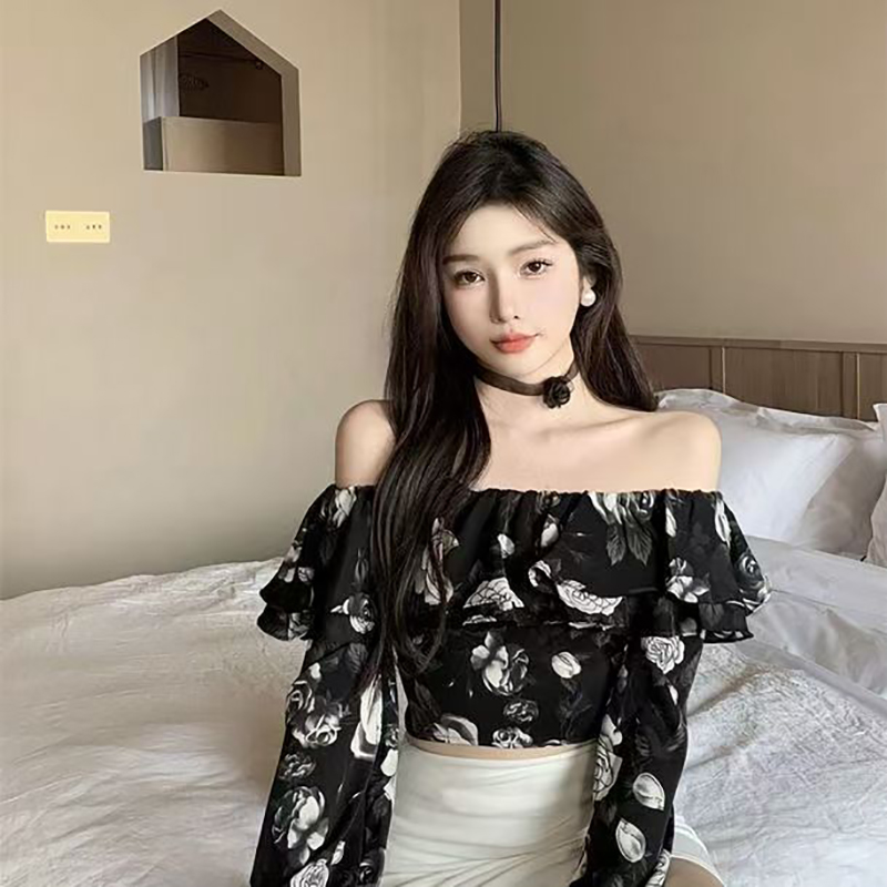 YF7222-图片色性感时尚一字肩荷叶边碎花露脐短装别致设计雪纺上衣
