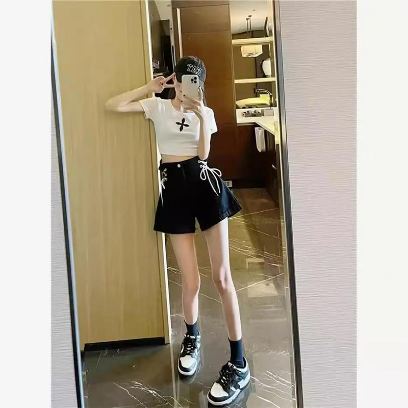 YF7224-图片色港式夏季新款穿洞绑绳系搞高腰设计小众别致感牛仔短裤