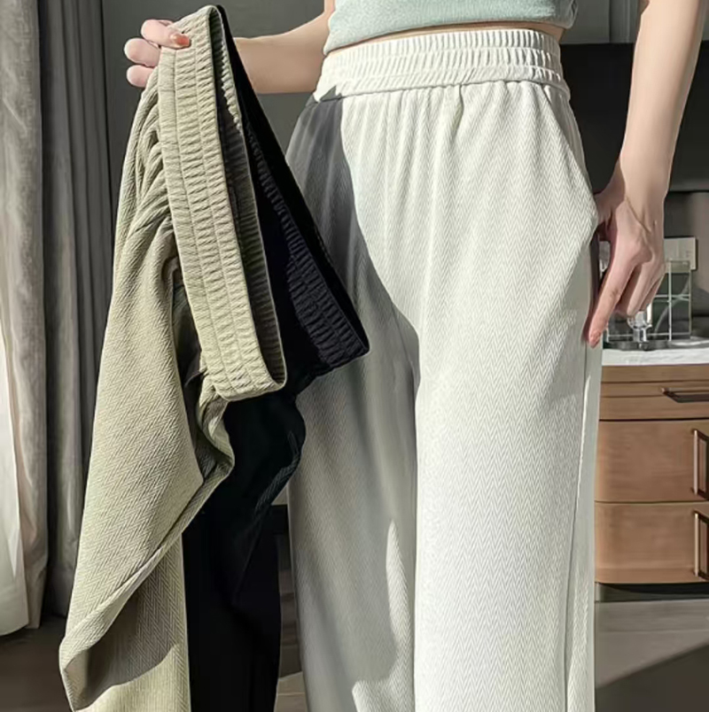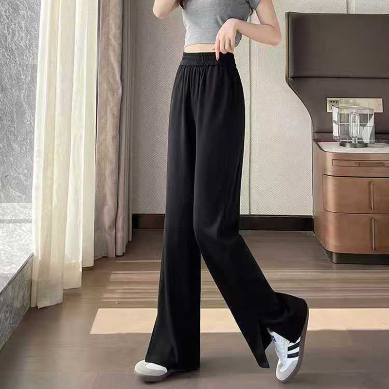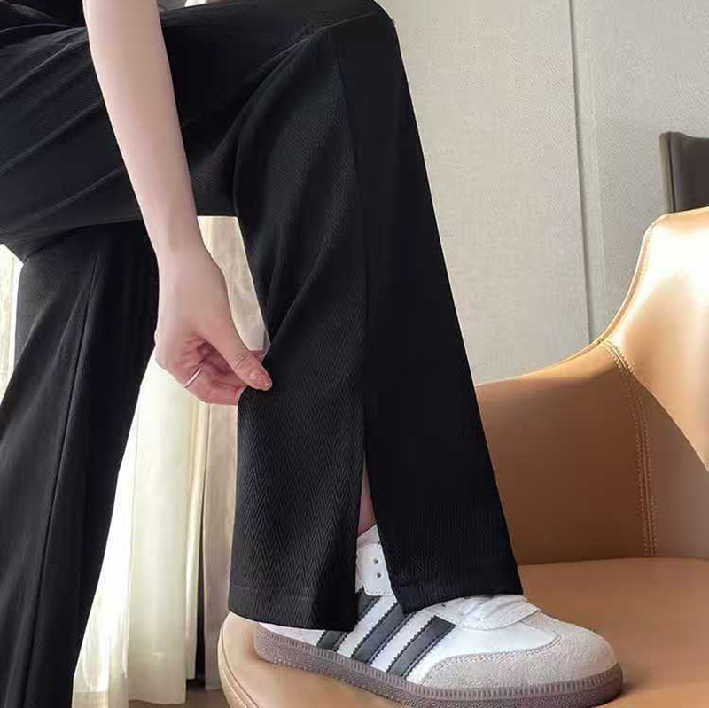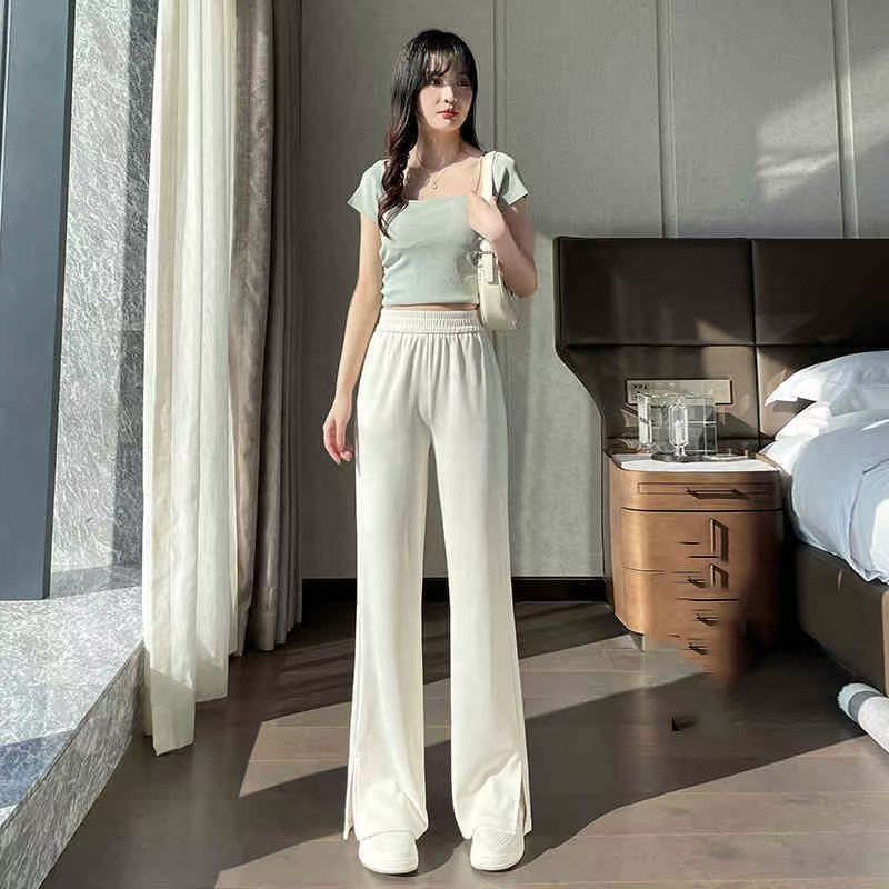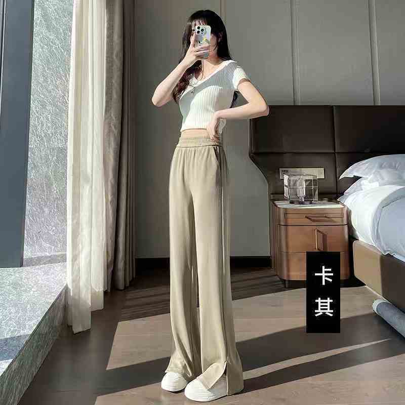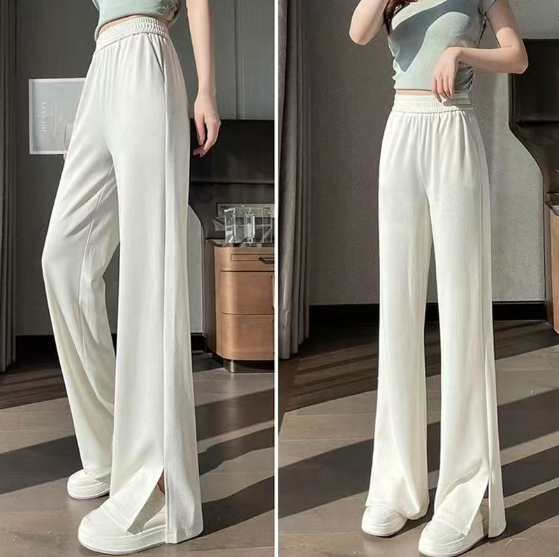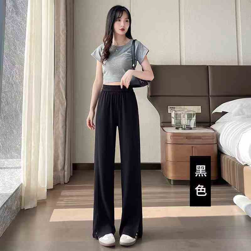 YF7230-(3色入内)韩版冰红不起球坠地感夏季高腰直筒开叉设计休闲百搭阔腿裤