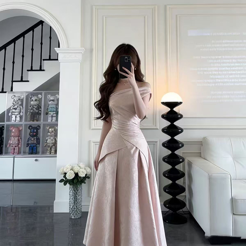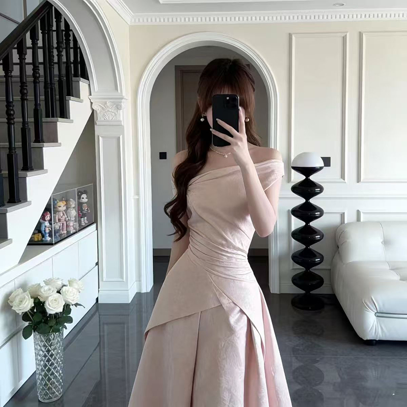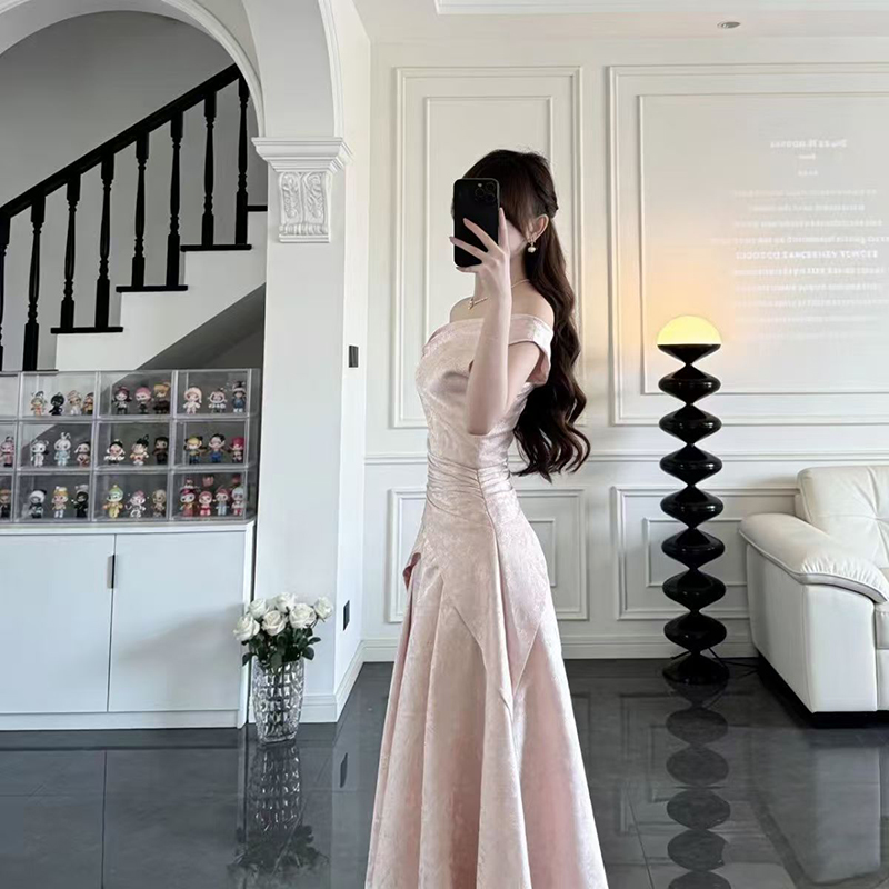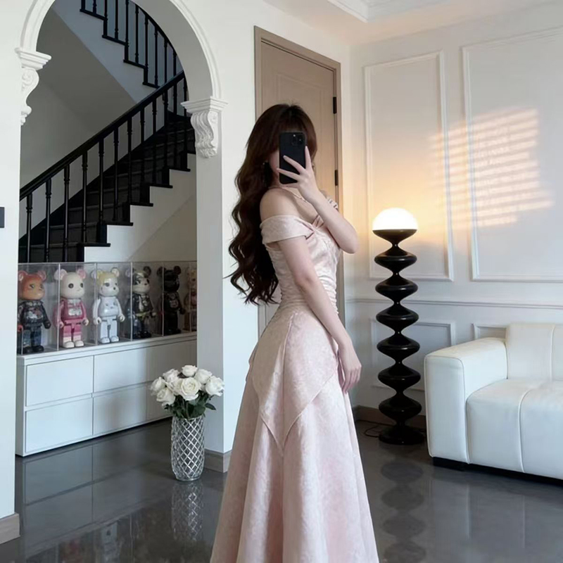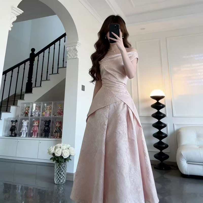 YF7234-图片色甜美时尚法式一字肩露肩交叉褶折提花名媛气质礼服连衣裙