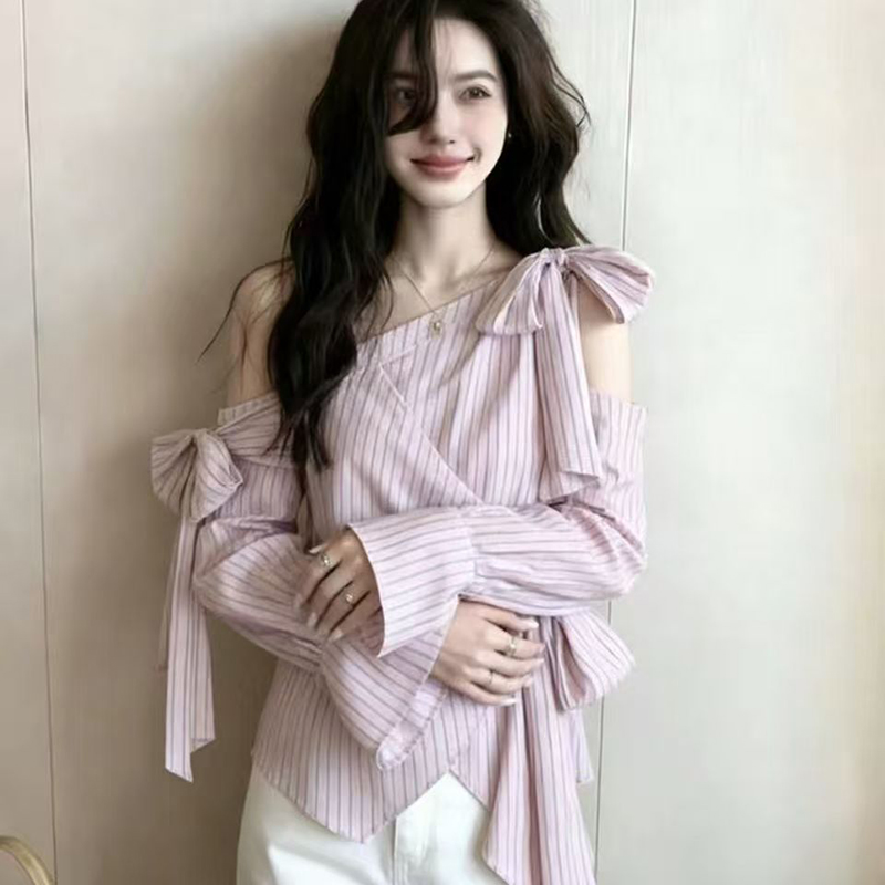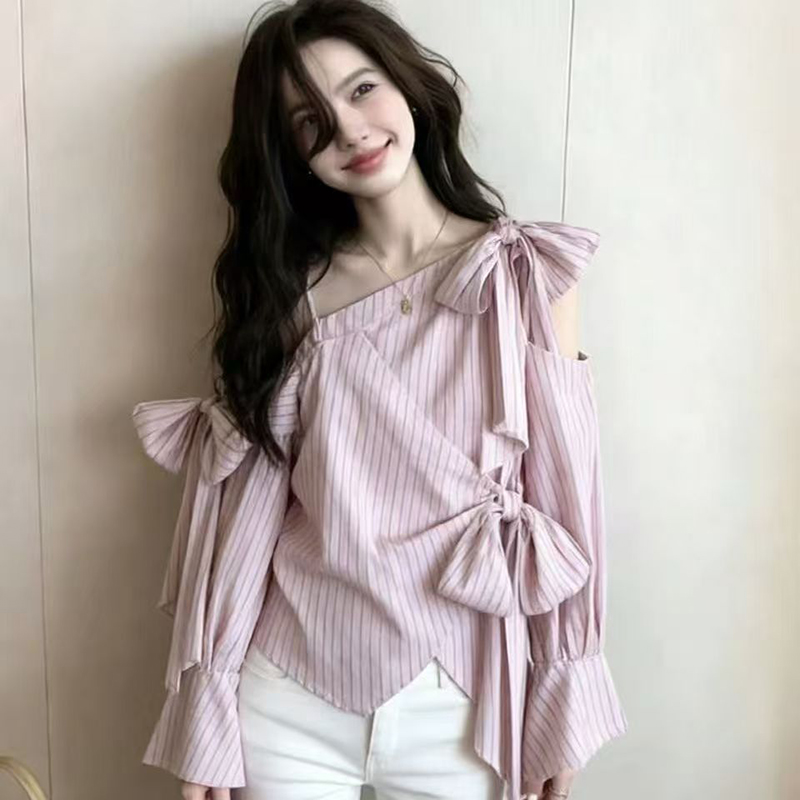 YF7238-图片色别致时尚镂空露肩系蝴蝶结条纹显瘦长袖大码韩版上衣