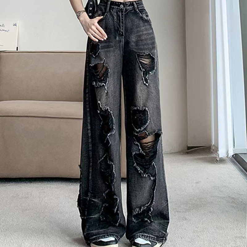 YF7239-图片色时尚美式破洞流苏乞丐版薄款夏季INS街头风坠地感牛仔裤