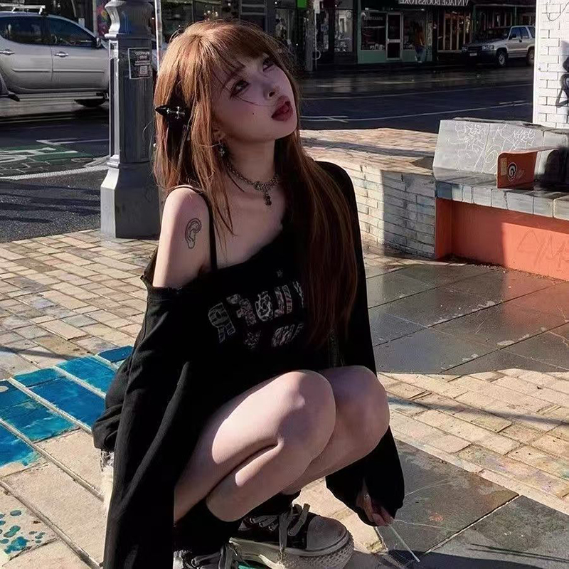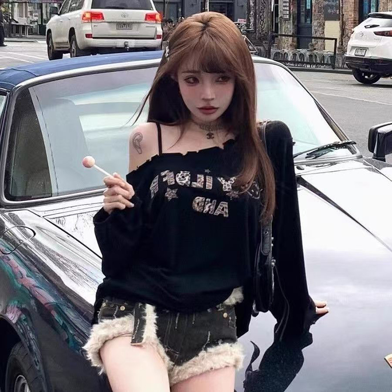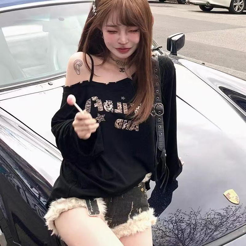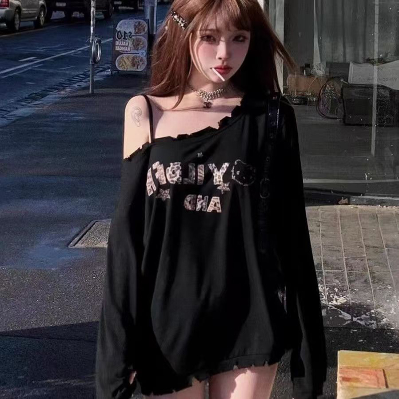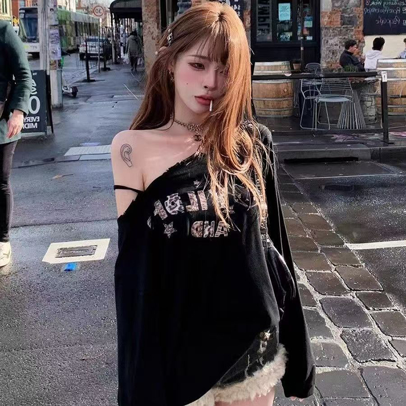 YF7242-图片色性感时尚纯欲风露肩花长袖宽松显瘦大码蝙蝠袖卫衣上衣