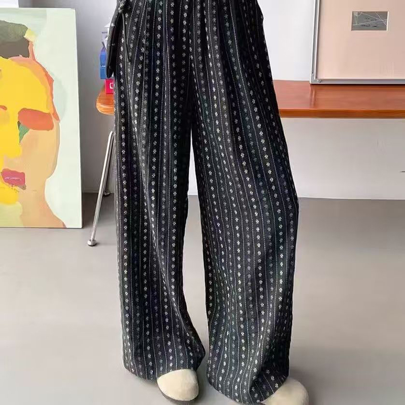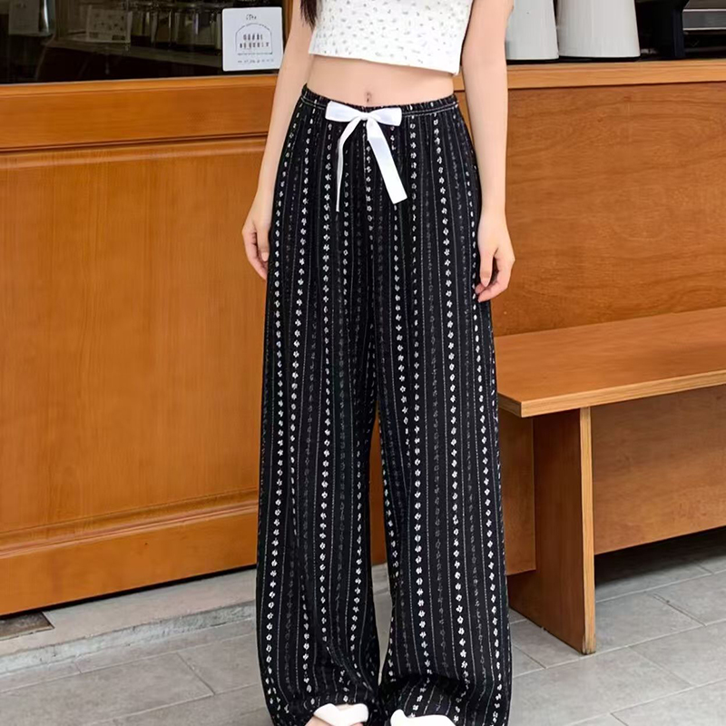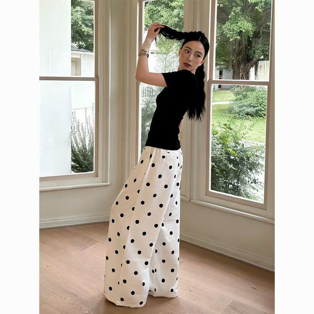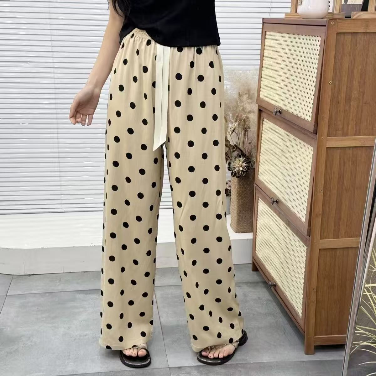YF7251-(2色入内)夏天新款松紧腰绑绳直筒坠地感薄款清爽绸质提花波点阔腿裤