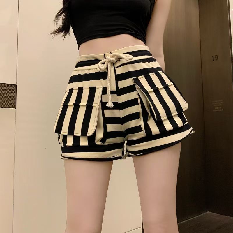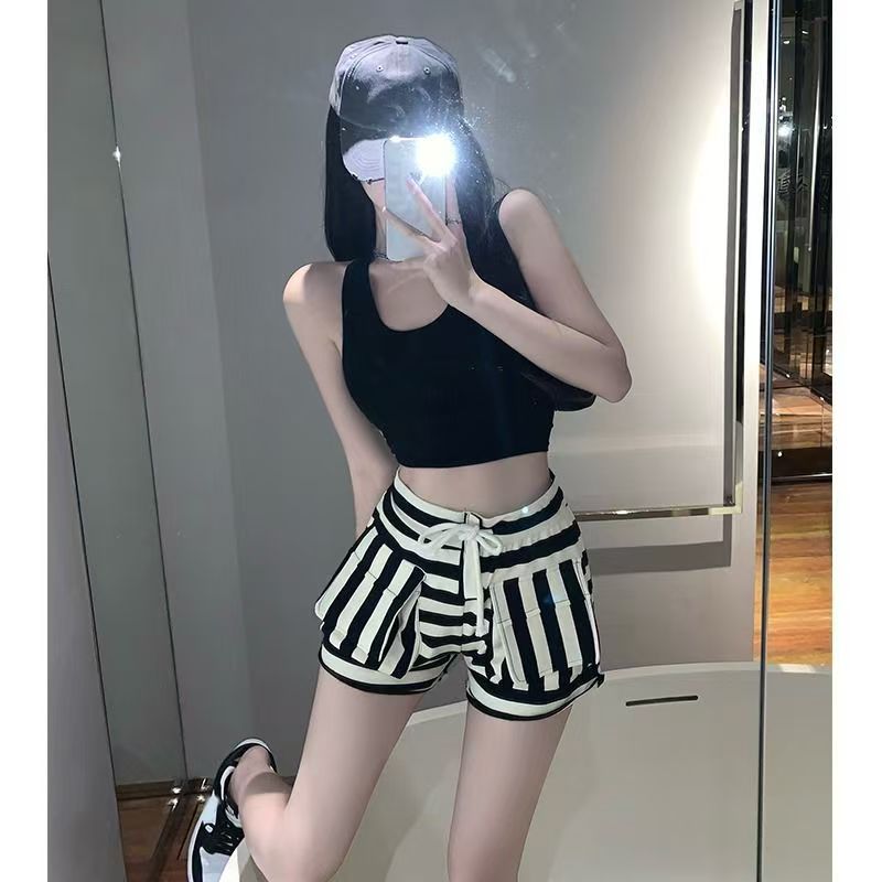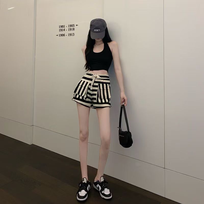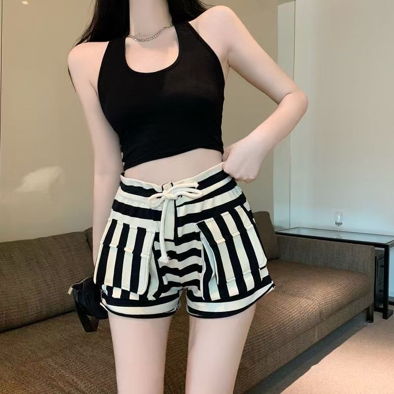 YF7252-图片色辣妹时尚新款抽绳高腰黑白撞色条纹设计A字阔腿休闲短裤