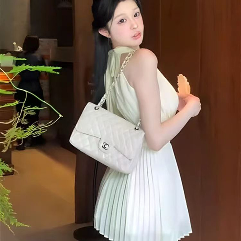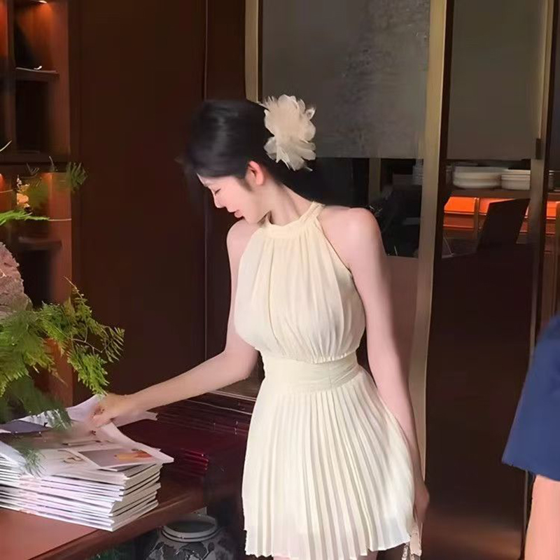 YF7269-图片色无袖高腰夏季小众套头收腰百褶纯欲风宴会短裙纯色雪纺裙子