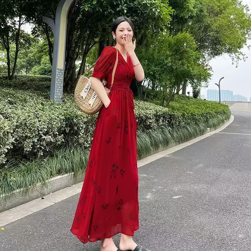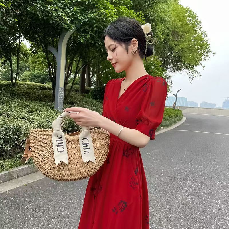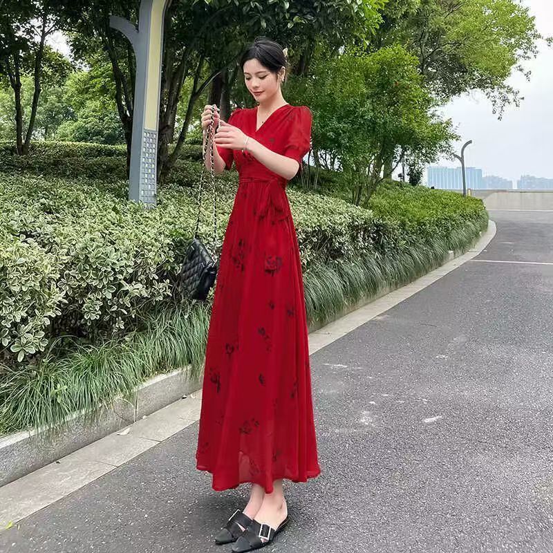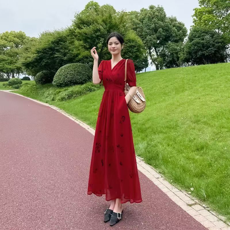 YF7272--图片色赫本风法式甜美红色碎花短袖V领收腰中长款复古连衣裙