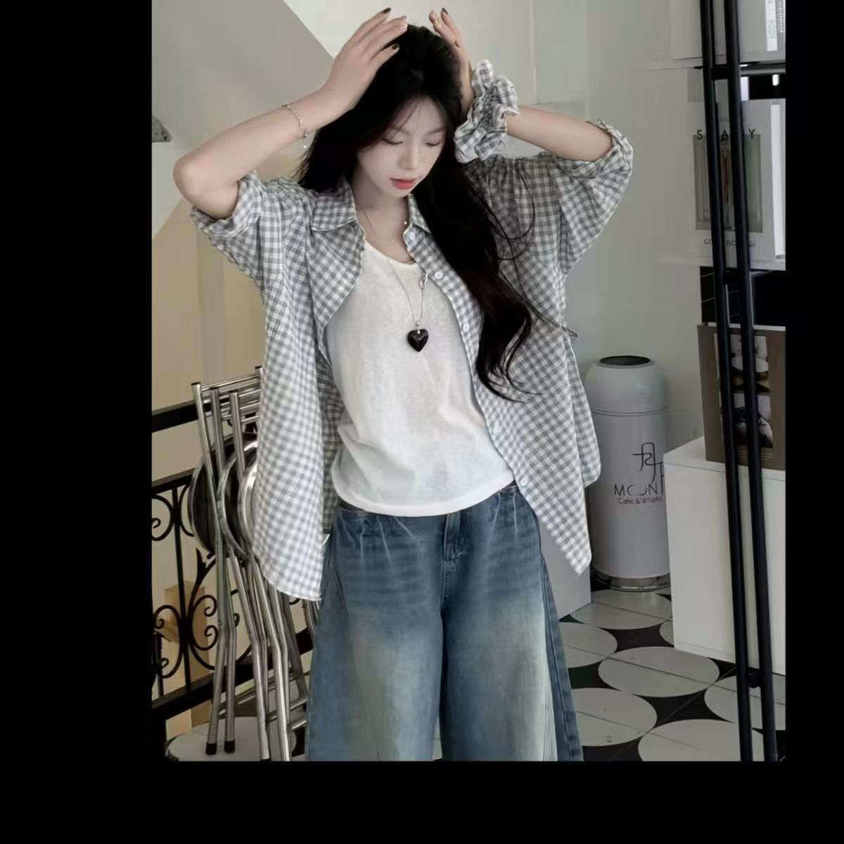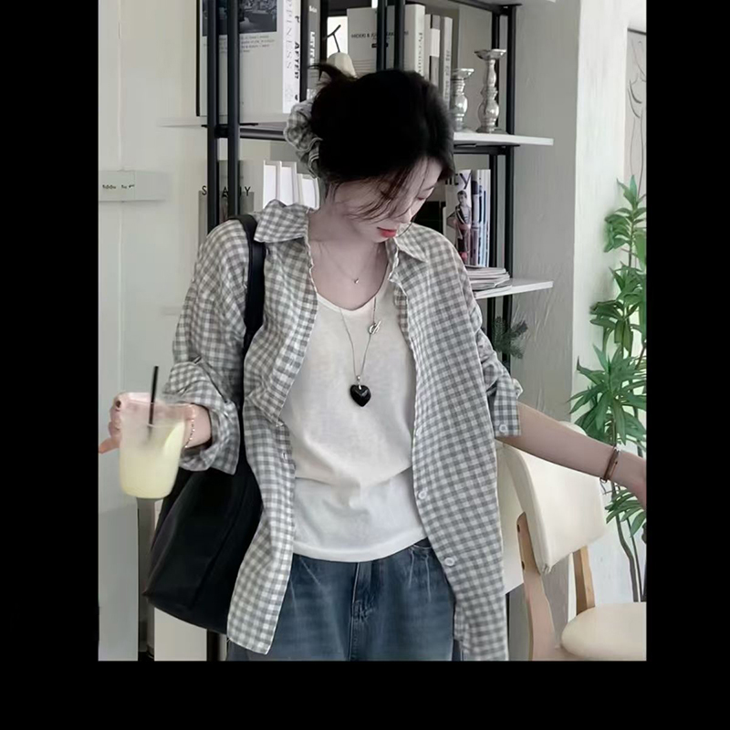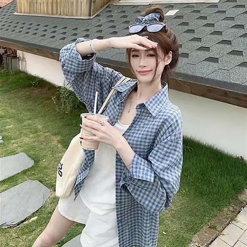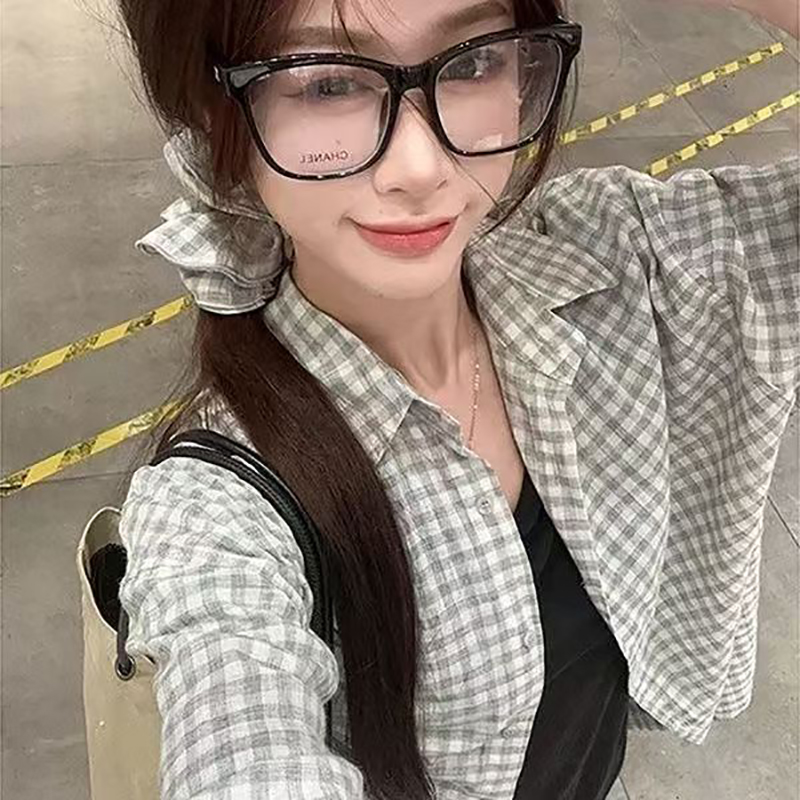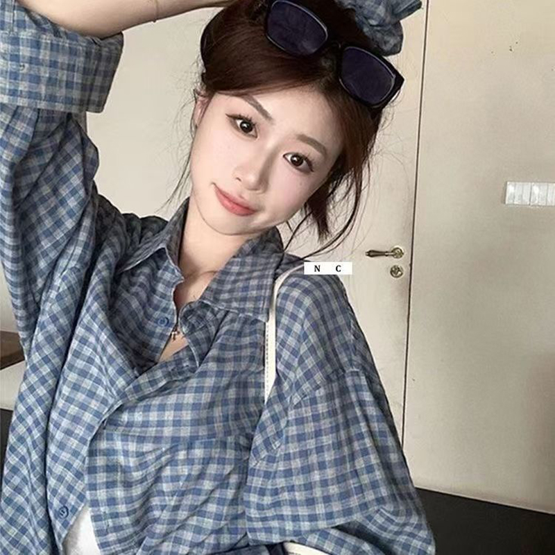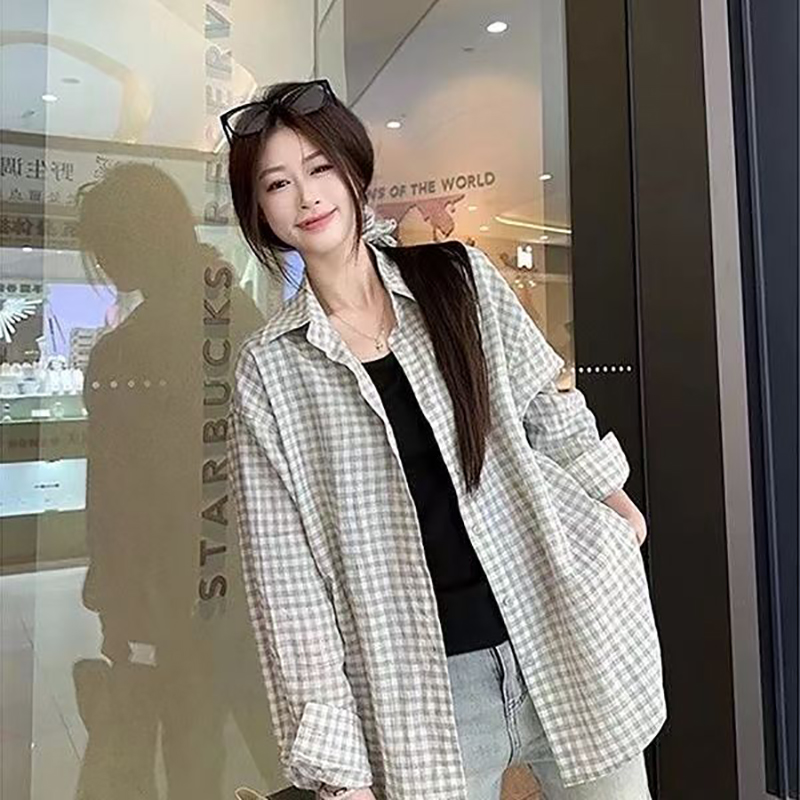 YF7274-(2色入内)港式胖MM显瘦大码长袖POLO领慵懒风复古格子衬衣