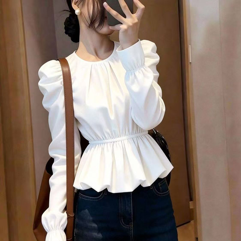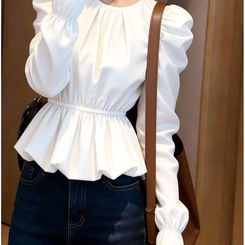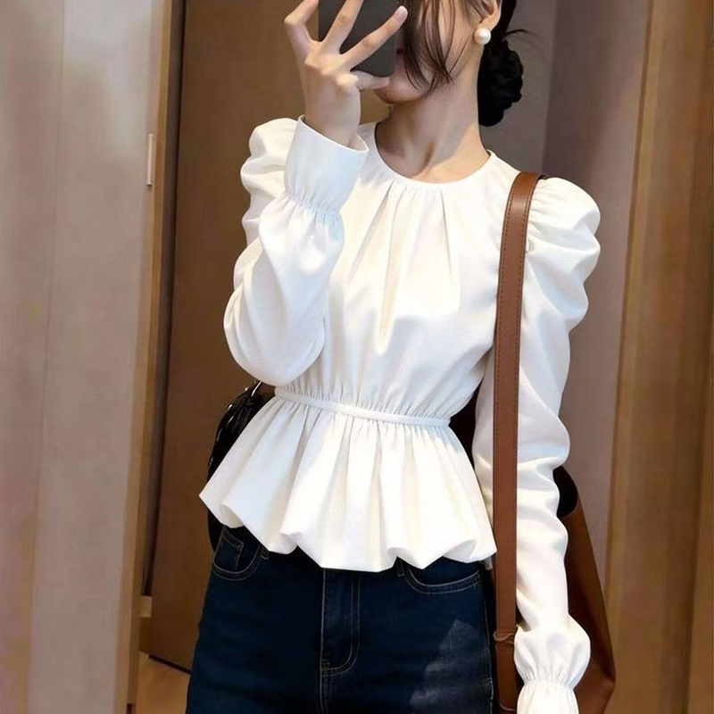 YF7277-图片色白色别致泡泡袖套头褶折收腰荷叶边韩版新款上衣