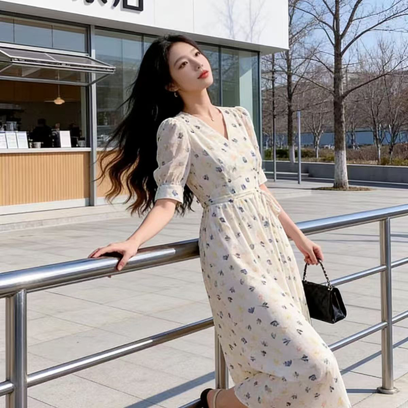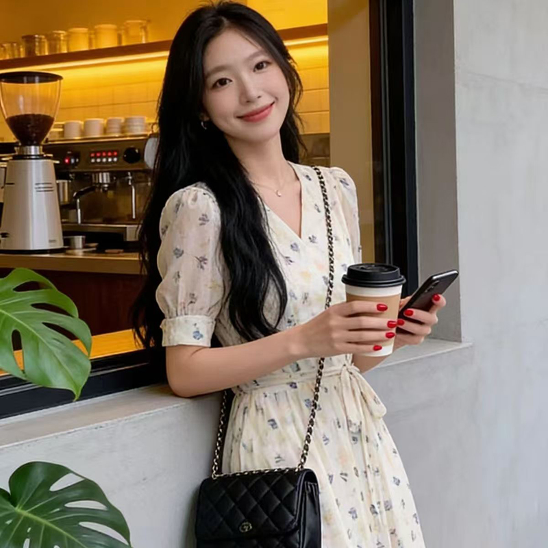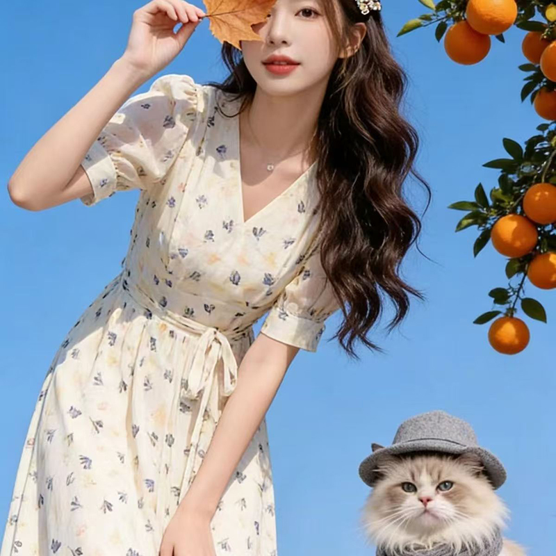 YF7280--图片色时尚夏季度假休闲碎花V领绑绳显瘦复古气质开叉新款裙子