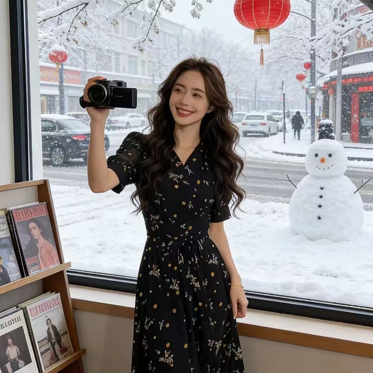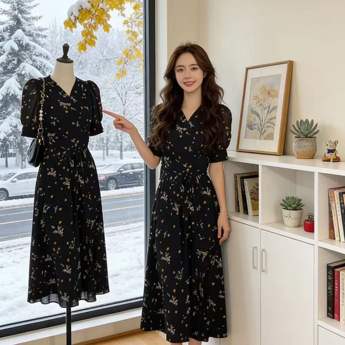 YF7280--图片色时尚夏季度假休闲碎花V领绑绳显瘦复古气质开叉新款裙子