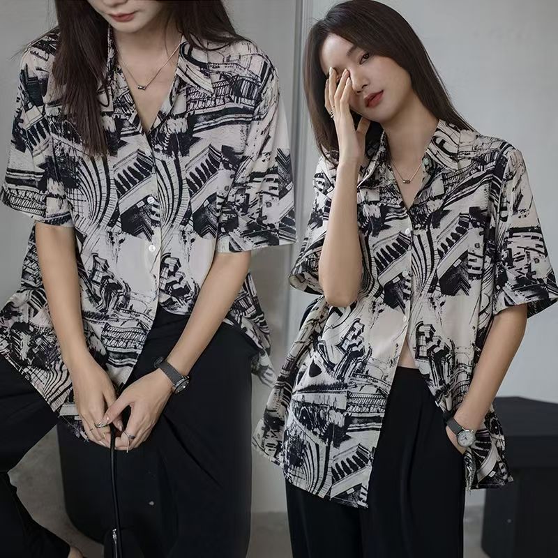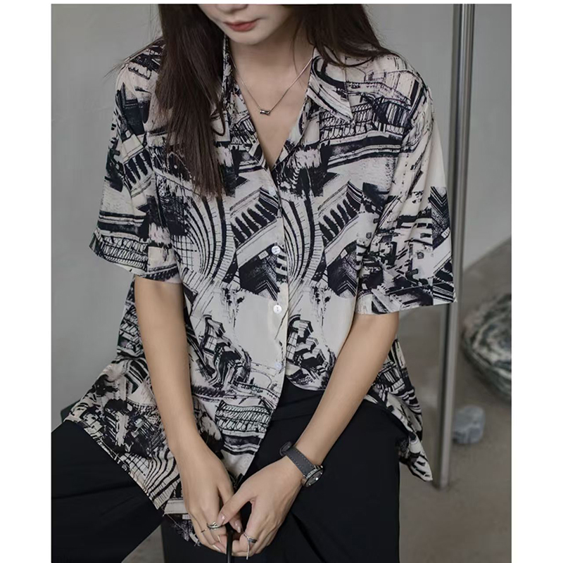 YF7283-图片色港式时尚涂鸦印花POLO领短袖宽松显瘦大码休闲百搭雪纺衫