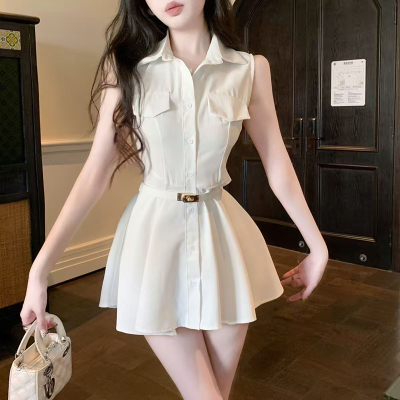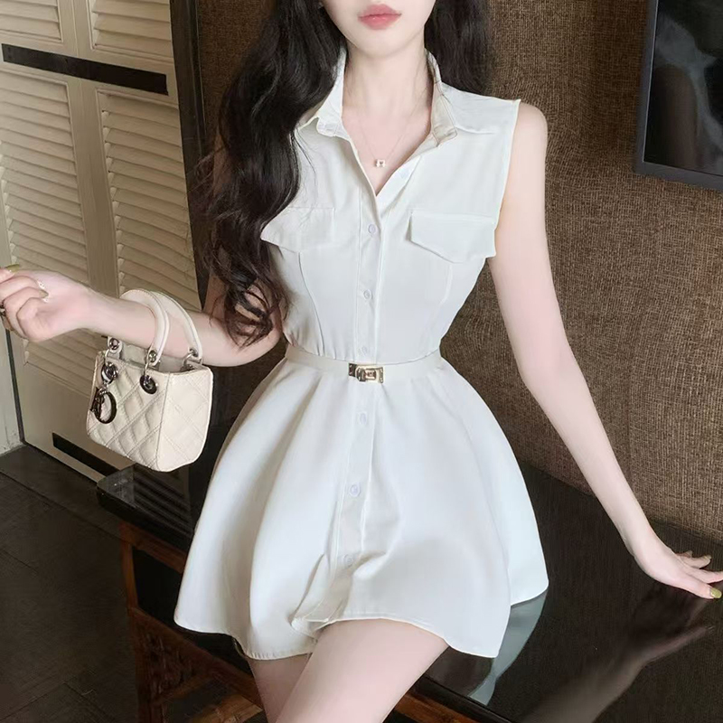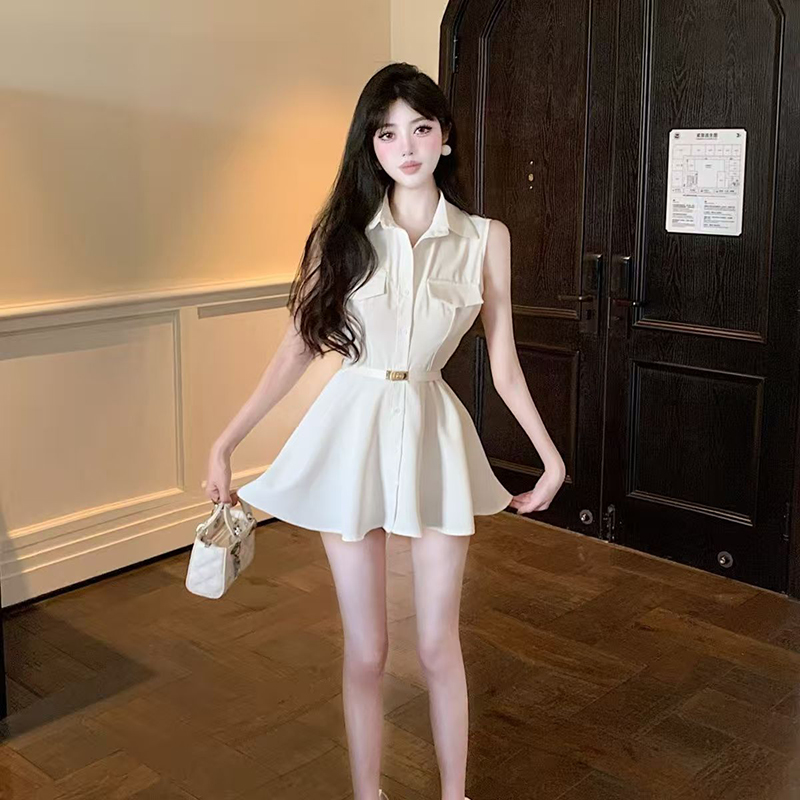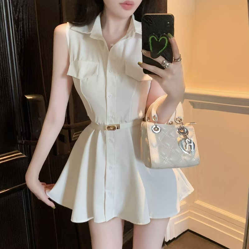 YF7286-(2色入内)夏季无袖翻领系扣束腰带收腰显瘦黑色赫本风法式雪纺连衣裙
