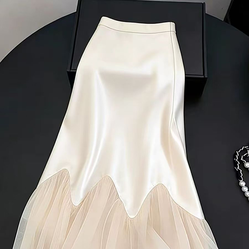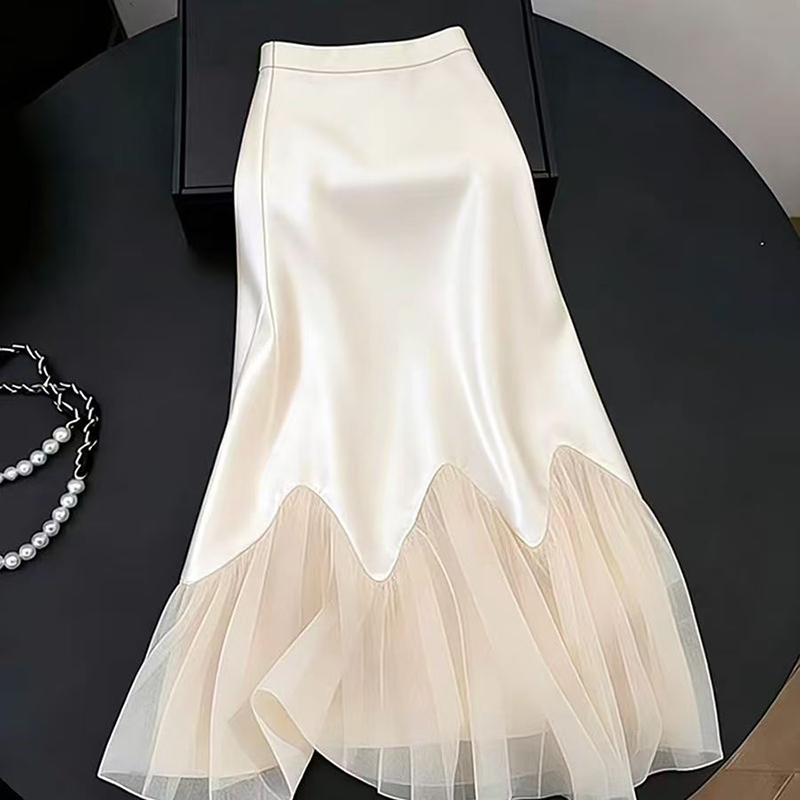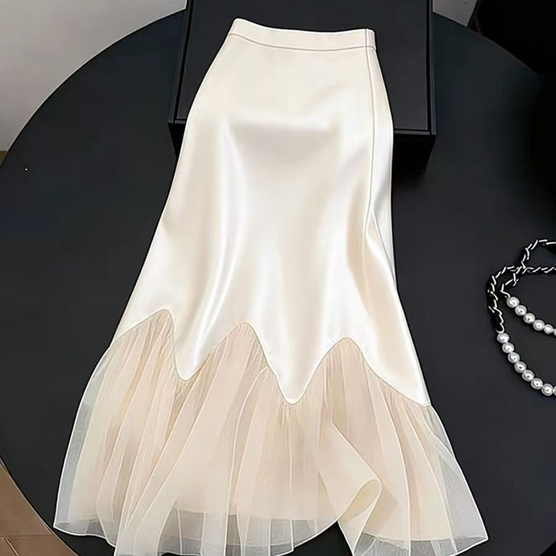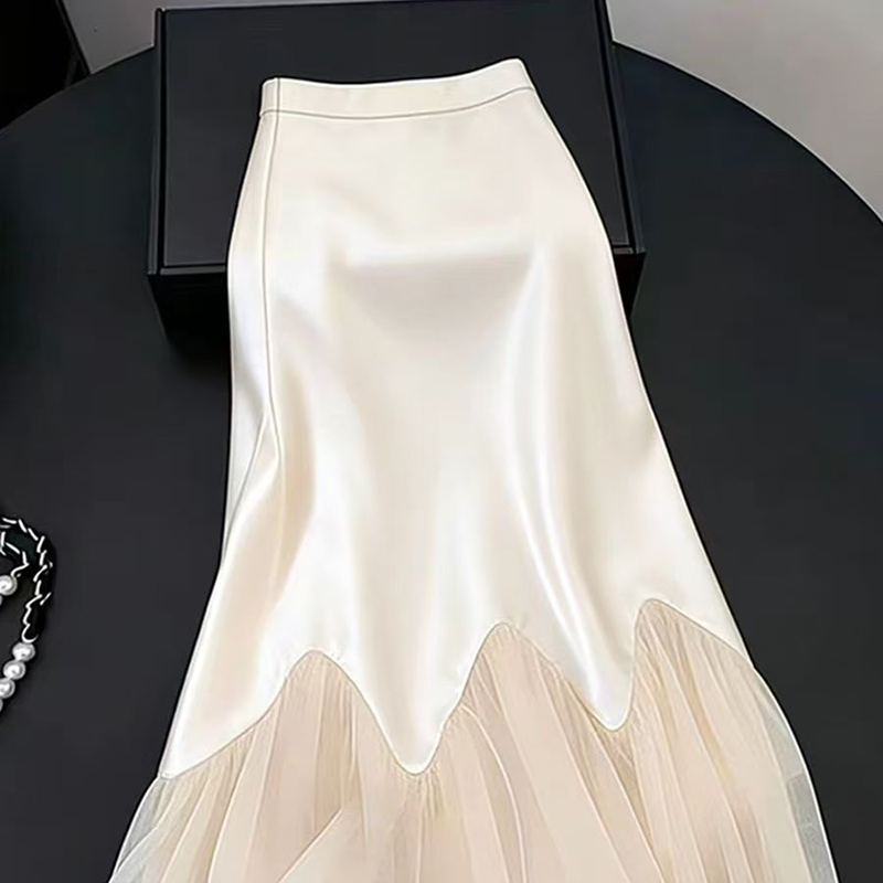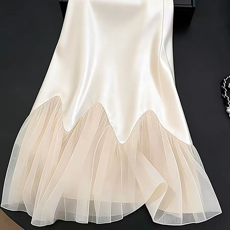 YF7398-图片色轻奢高级夏季新款高腰包臀网纱不规则拼接缎面蕾丝裙
