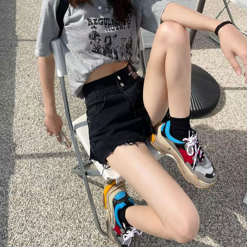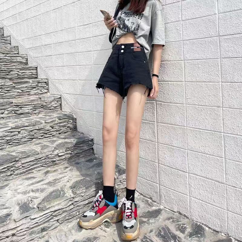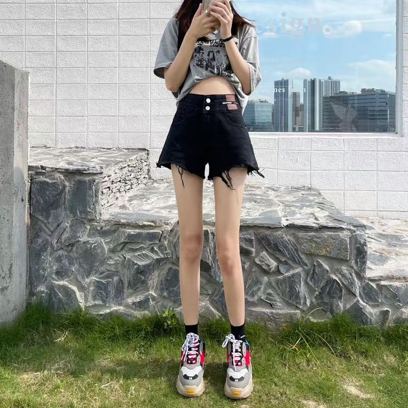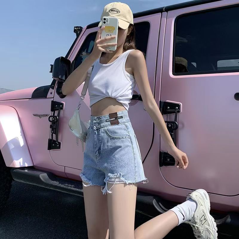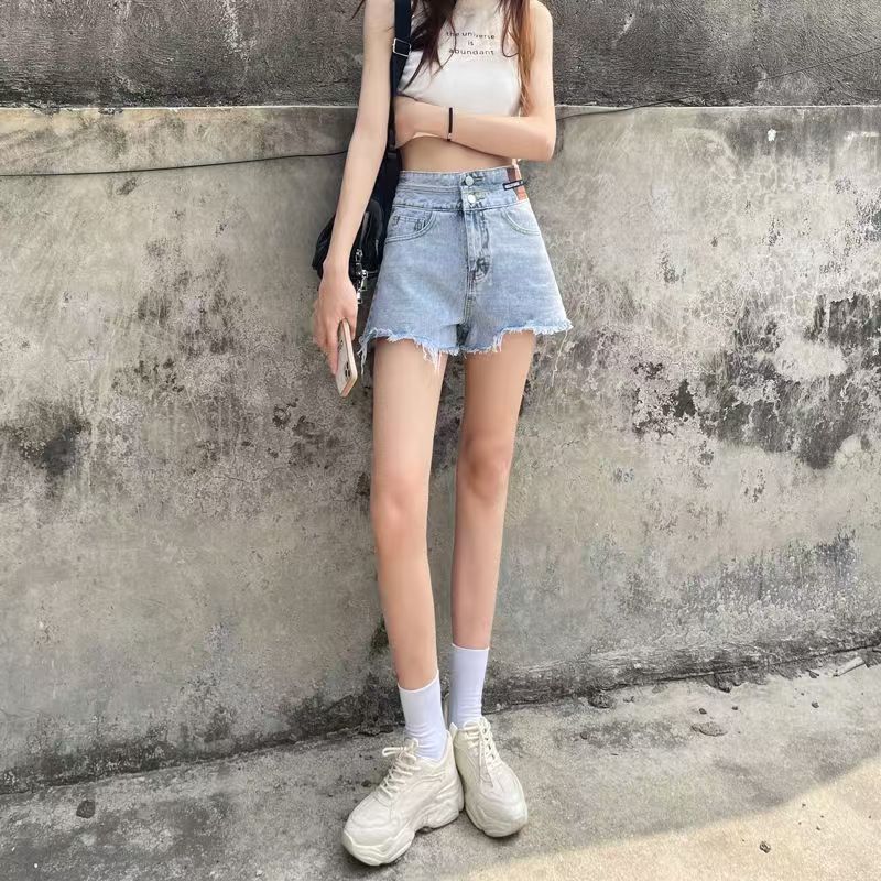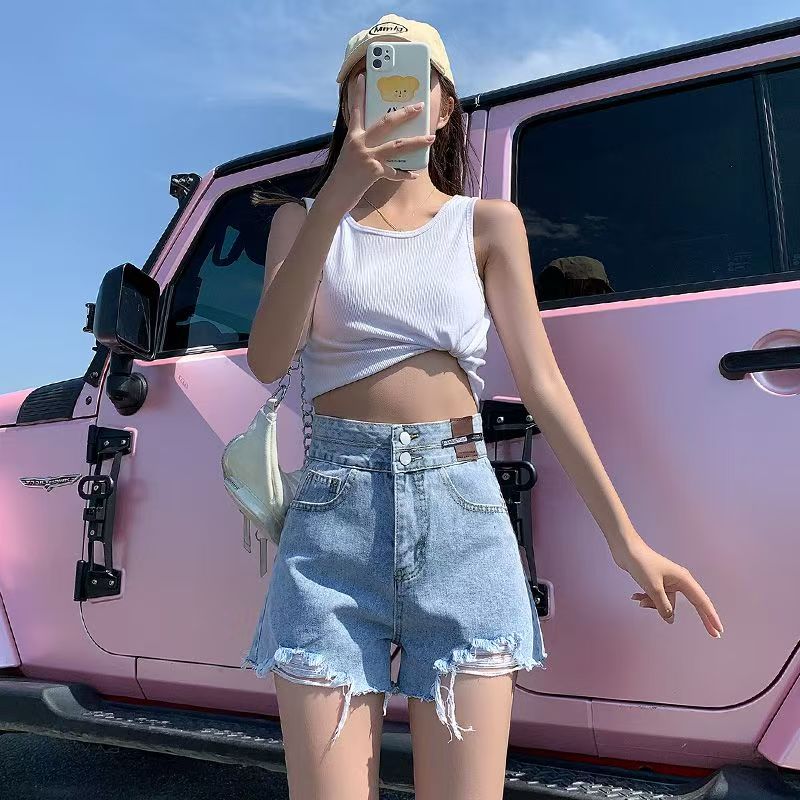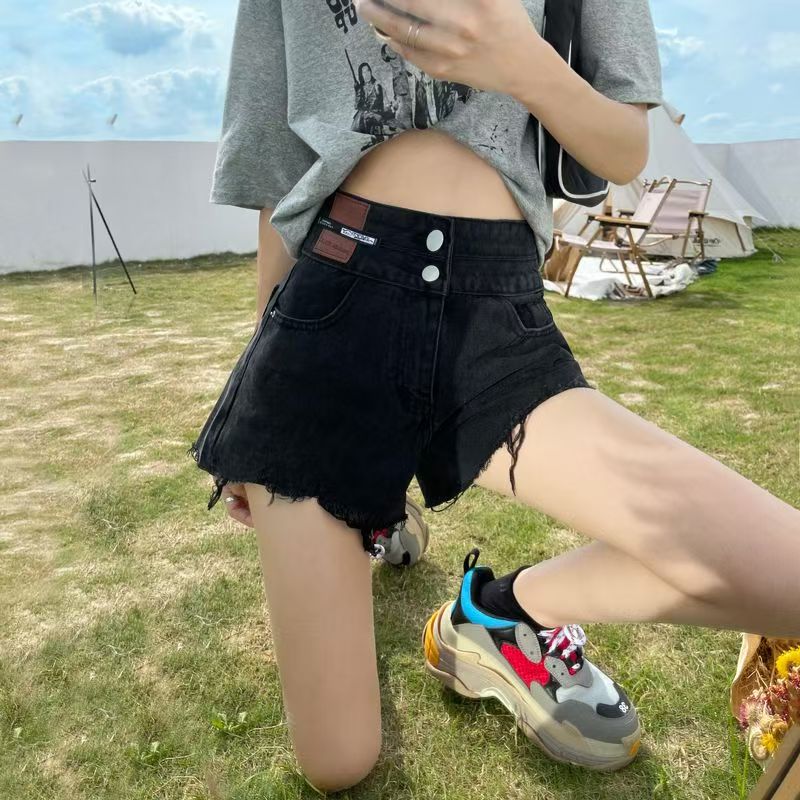 YF7399-(2色入内)夏季小心机贴标双纽扣流苏破洞设计新款牛仔短裤韩版辣妹热裤