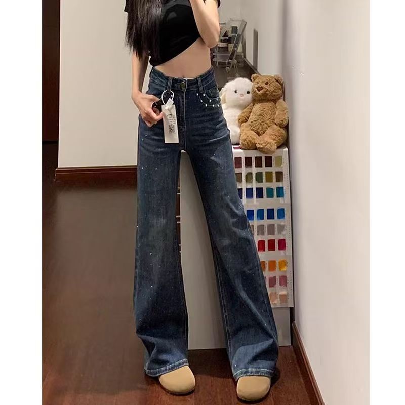 YF7404-图片色时尚辣妹复古蓝口袋铆钉满天星烫钻设计直筒坠地感牛仔裤