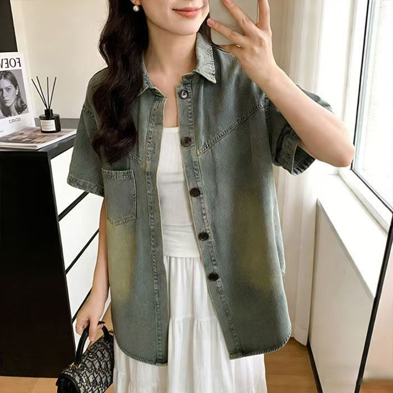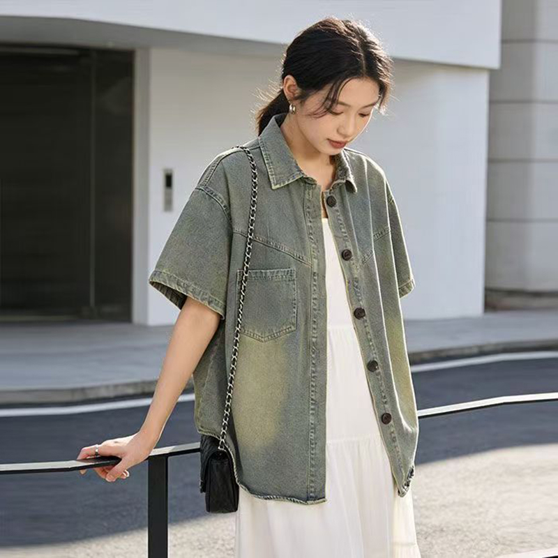 YF7408-图片色复古色做旧洗水短袖POLO领系扣薄款夏季休闲牛仔上衣
