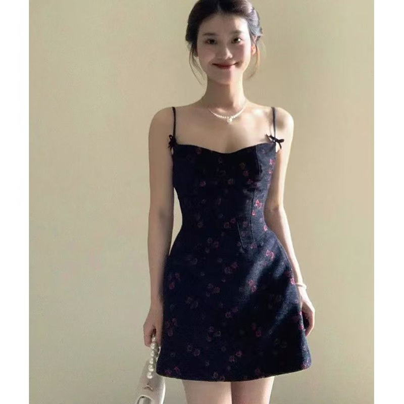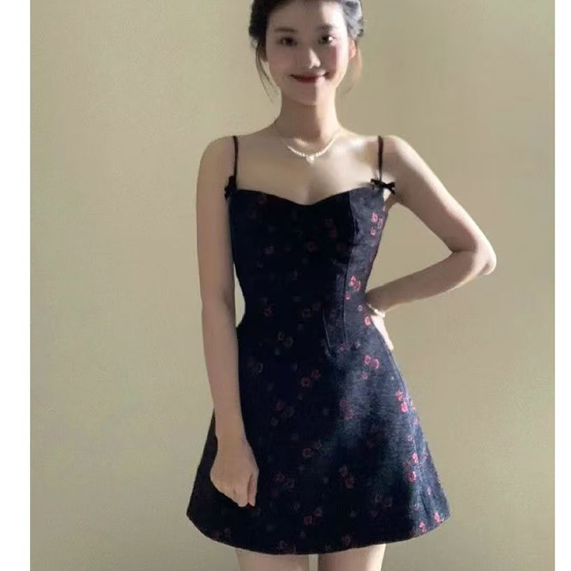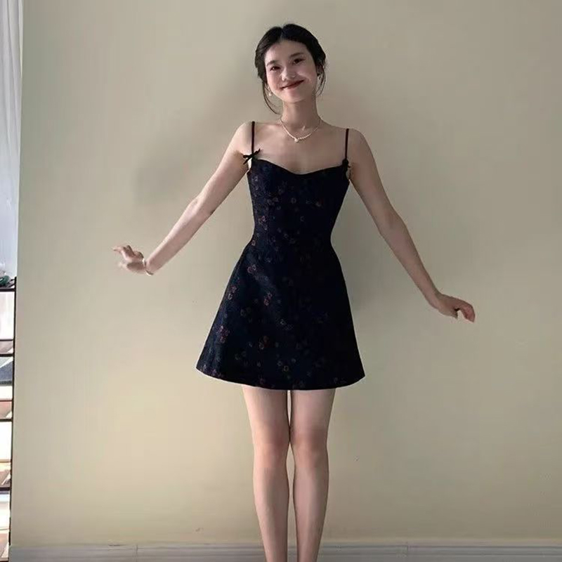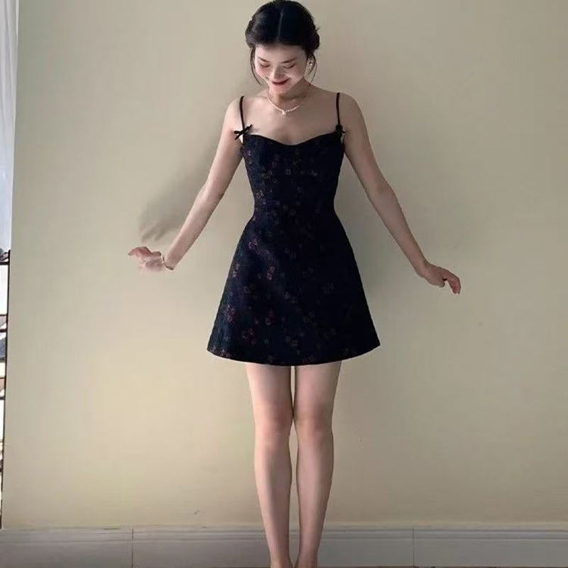 YF7410-图片色纯欲风吊带露肩修腰显瘦黑色碎花蝴蝶结A字背心裙