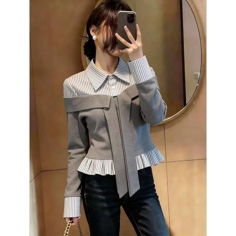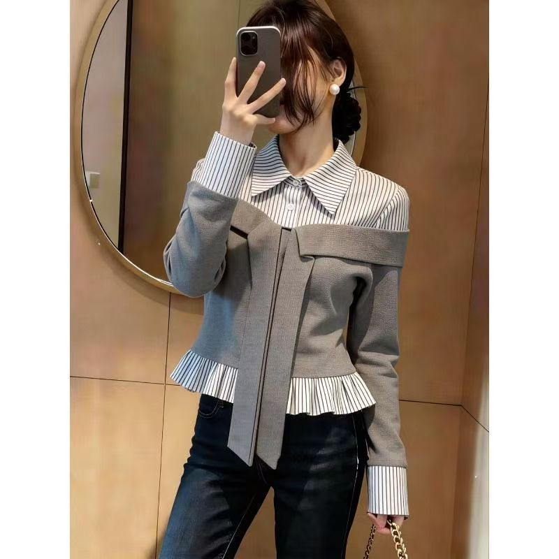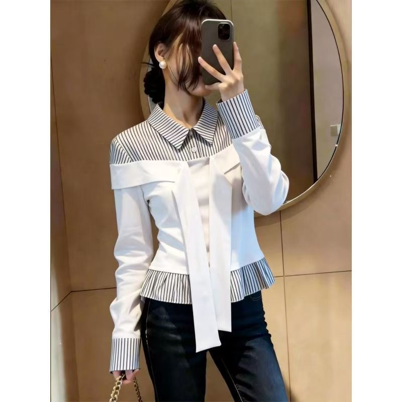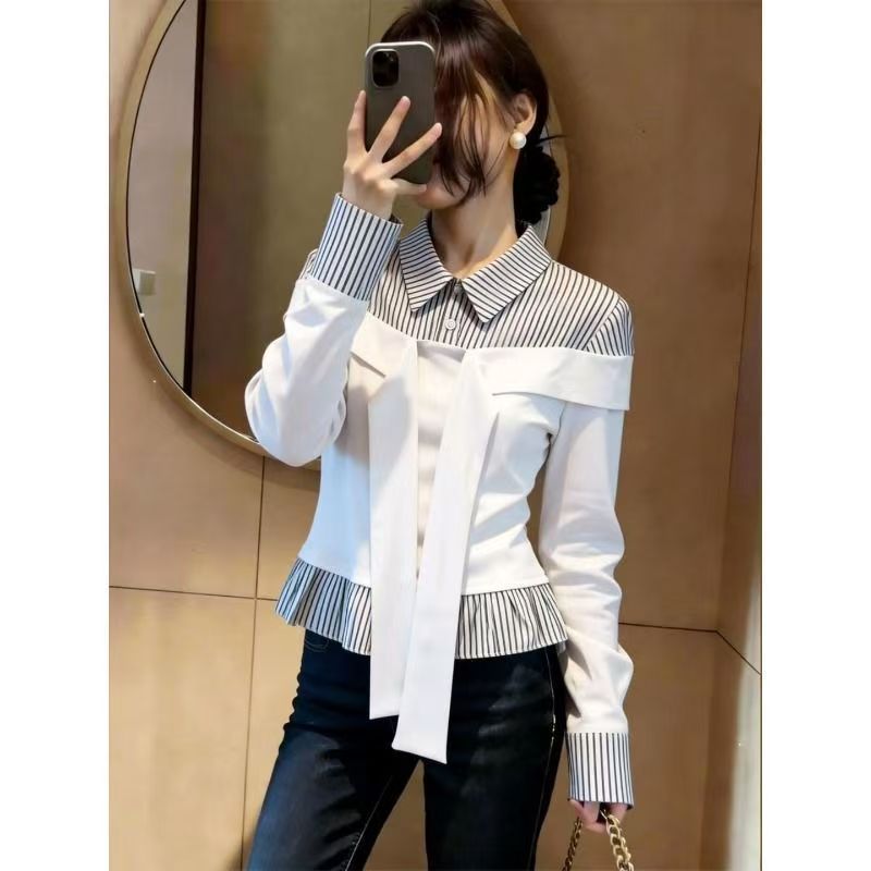 YF7415-(2色入内)假两件条纹拼接飘带设计别致感宽松显瘦小众气质上衣