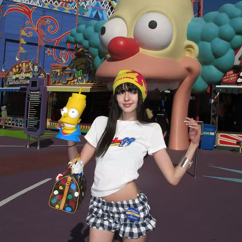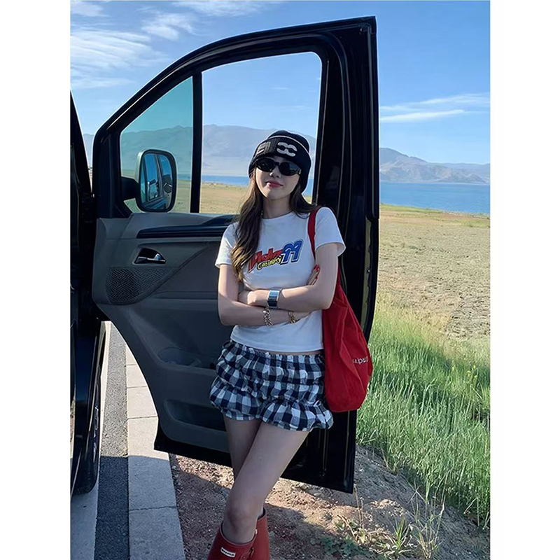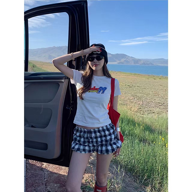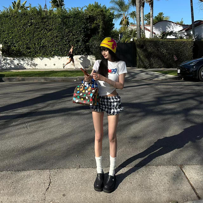 YF7416-图片色美式性感辣妹夏季超短低腰堆堆感花苞格子短裤