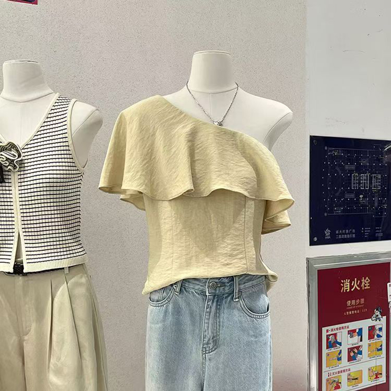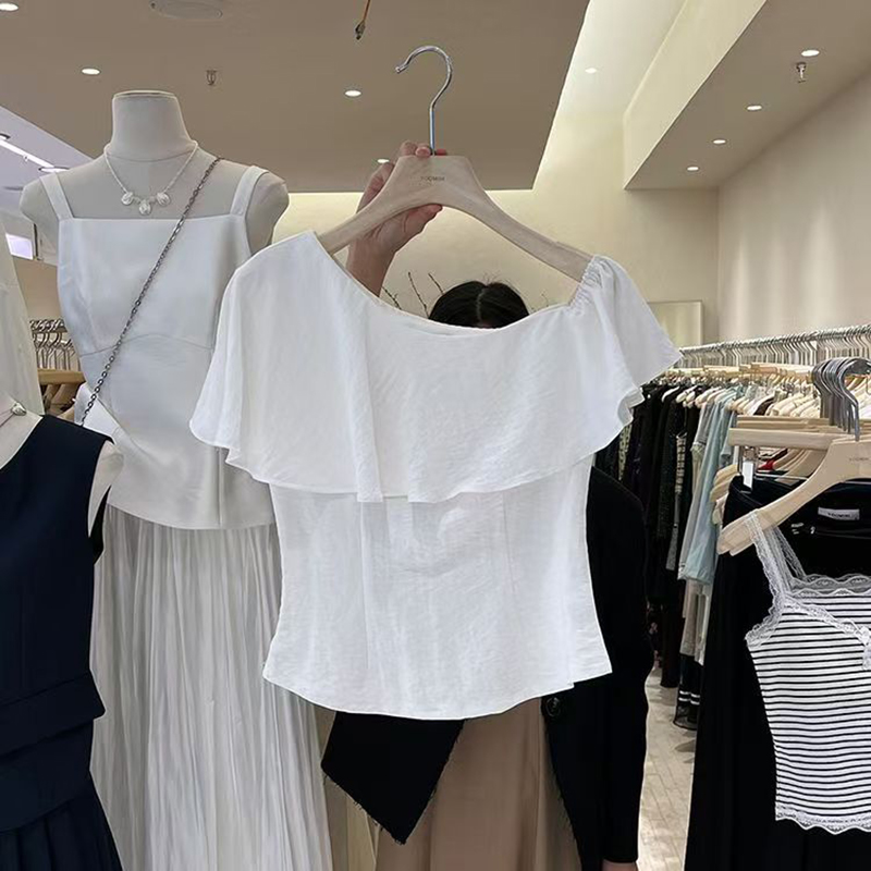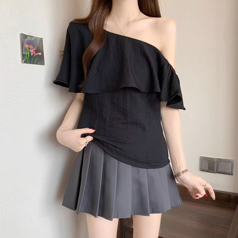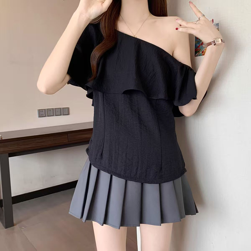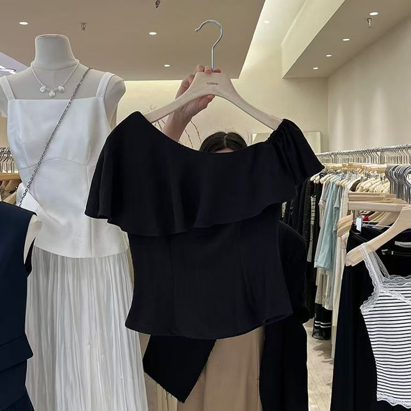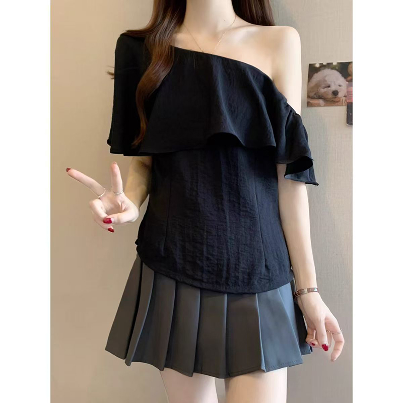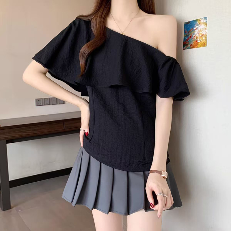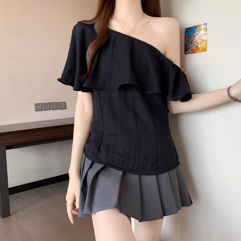 YF7424-(2色入内)性感时尚一字肩荷叶边宽松显瘦露肩纯色韩版新款夏季上衣