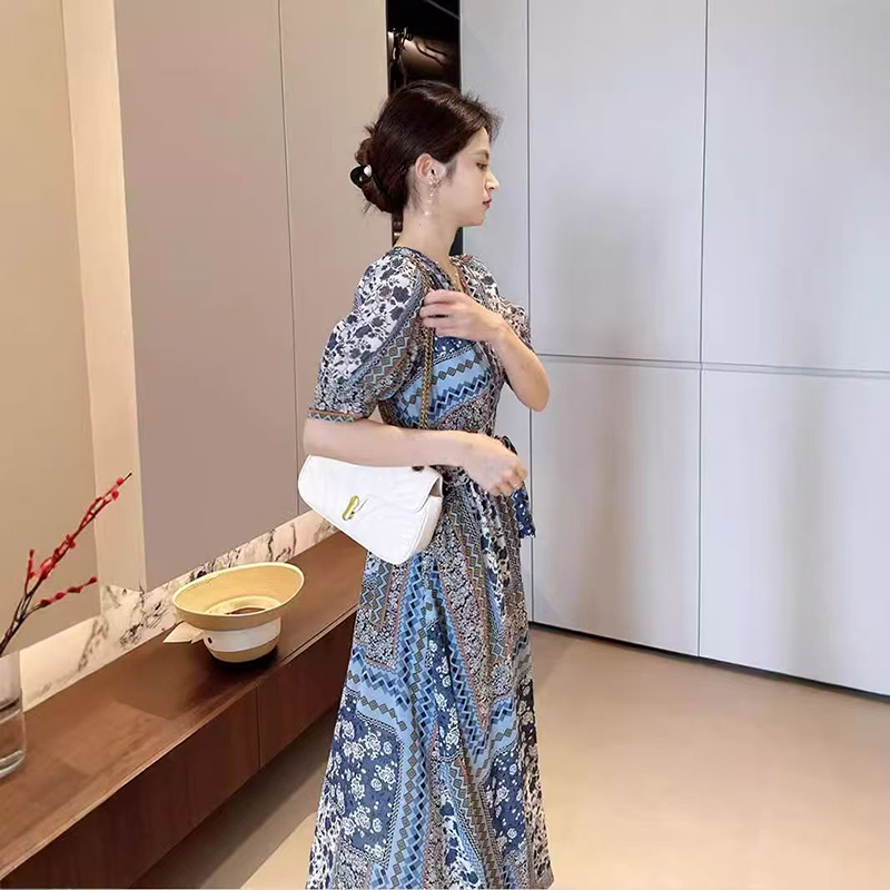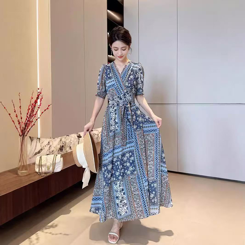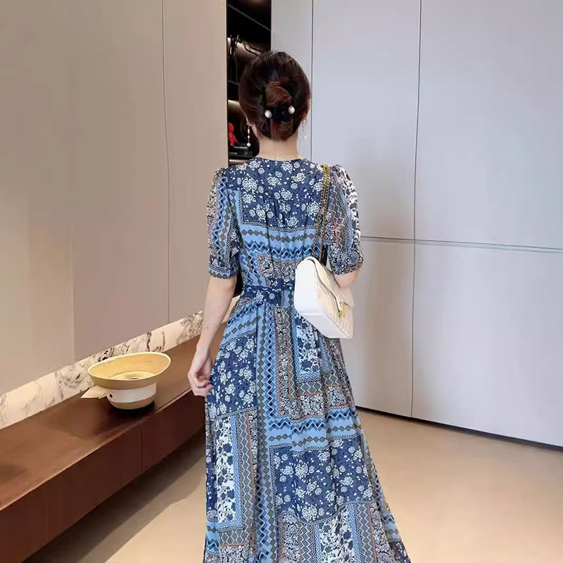 YF7279--图片色法式碎花短袖V领绑绳束腰复古蓝优雅夏季雪纺连衣裙