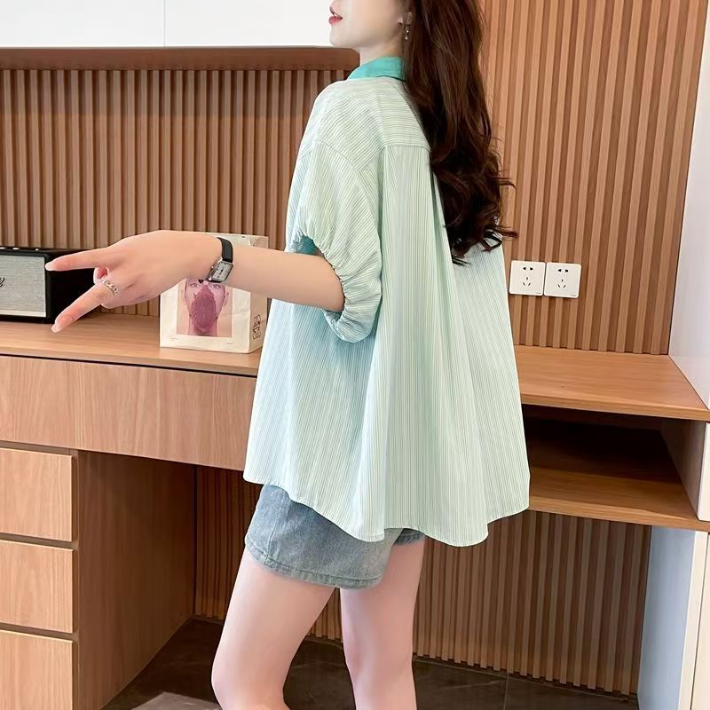 YF7428-图片色夏季小清新薄荷绿撞色翻领系扣条纹显瘦短袖衬衫