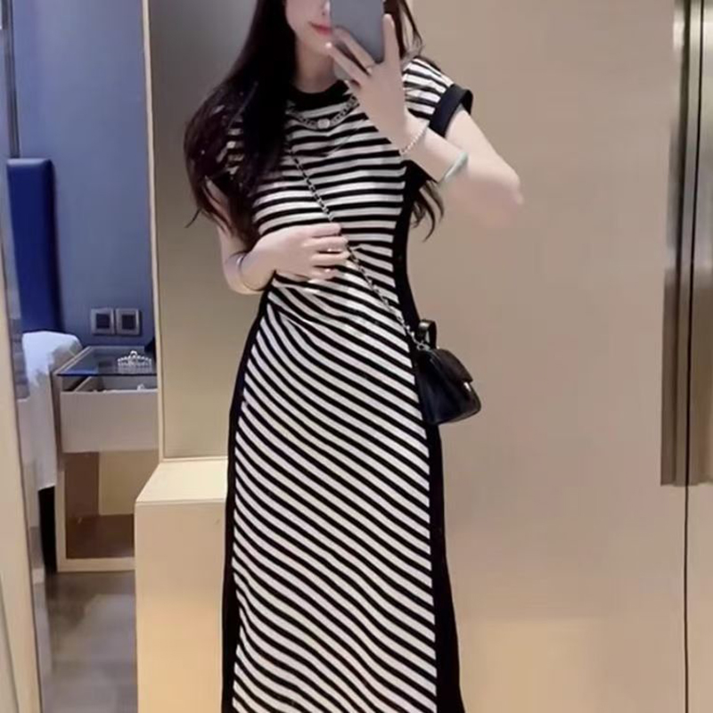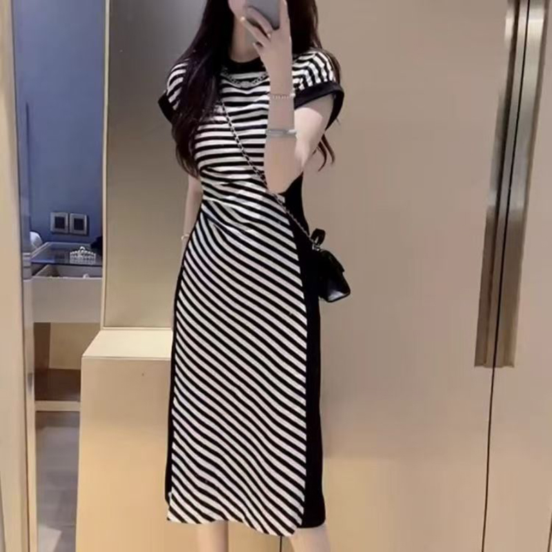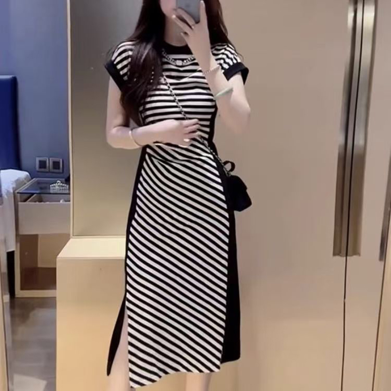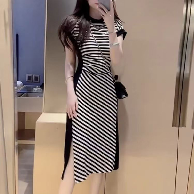 YF7430-图片色夏季名媛气质圆领修腰撞色开叉设计条纹显瘦休闲风连衣裙