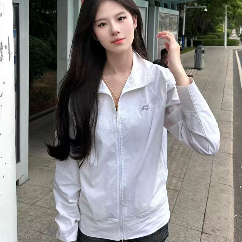 YF7431-图片色港式长袖翻领拉链字母印花休闲百搭薄装风衣外套防晒上衣