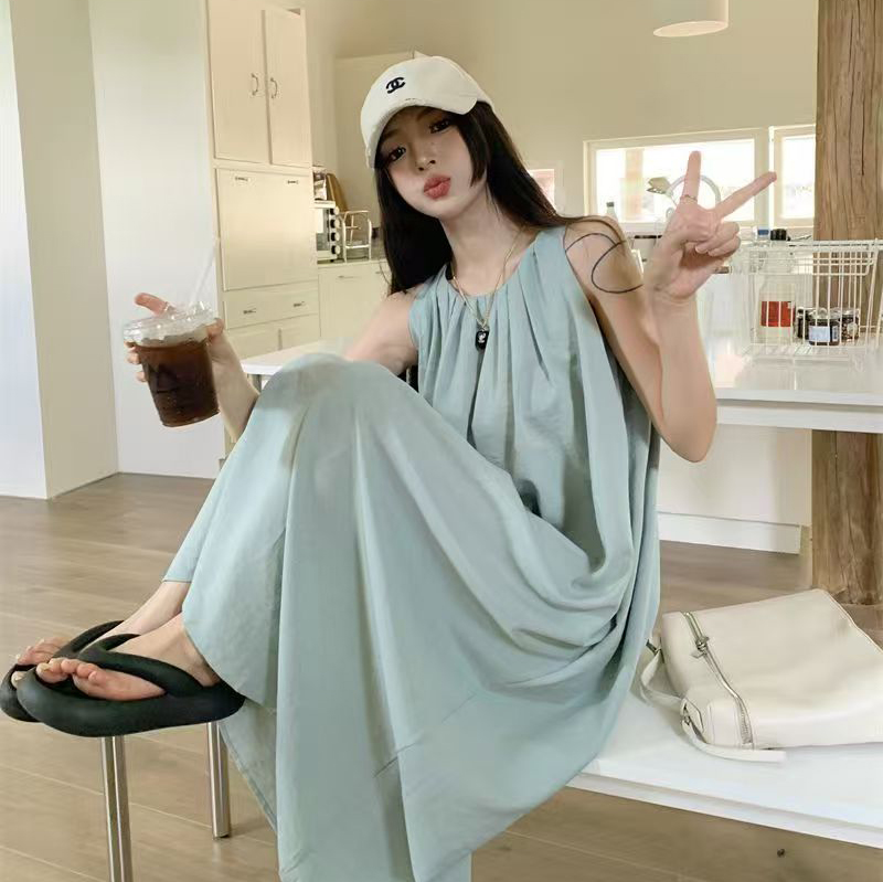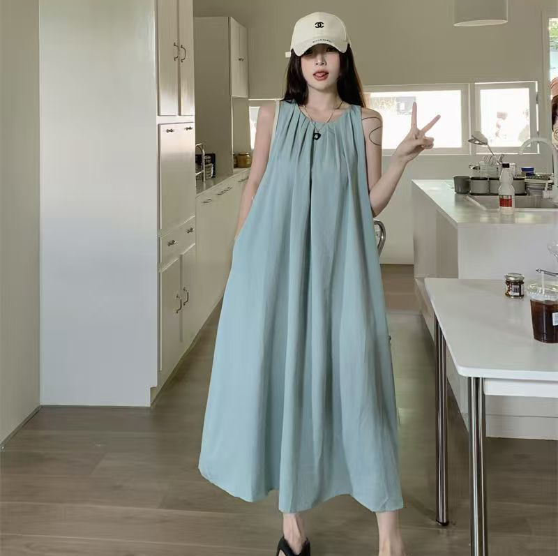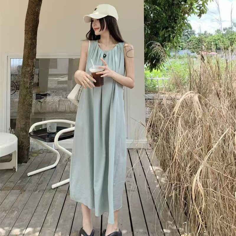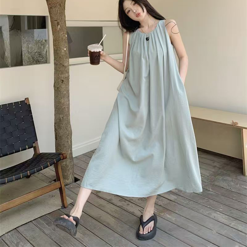 YF7438--图片色法式无袖套头露背A字纯色简约风显瘦宽松长裙新款连衣裙