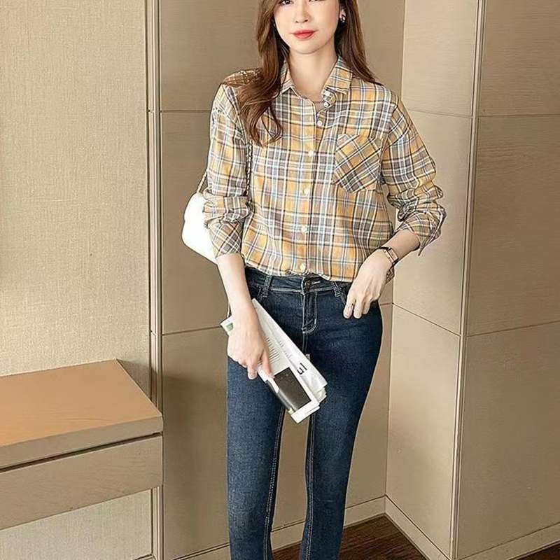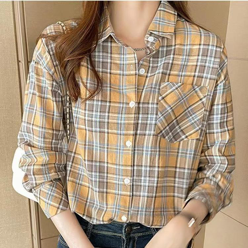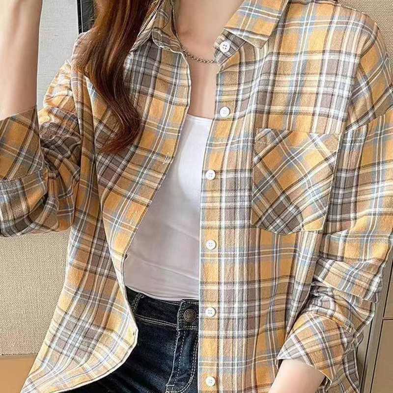 YF7440-图片色港式慵懒风长袖翻领复古格子宽松显瘦休闲百搭上衣