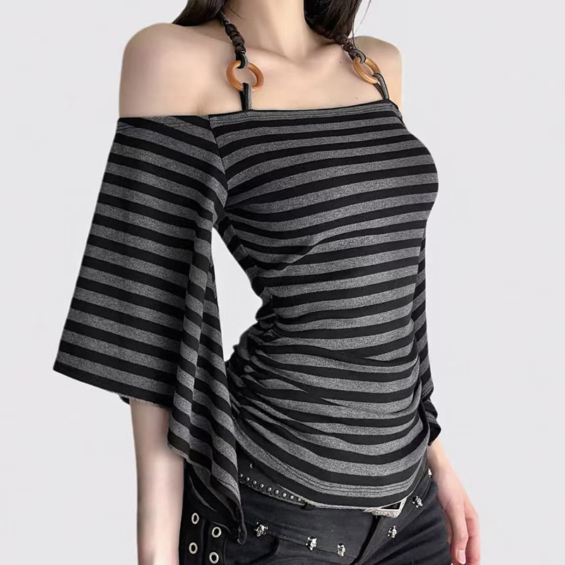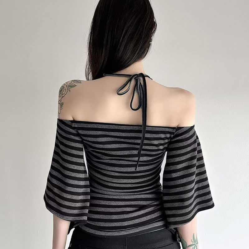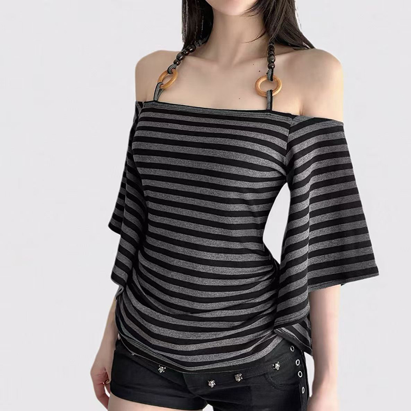 YF7456-图片色纯欲风一字肩弹力修腰条纹显瘦五分袖夏季韩版新款上衣