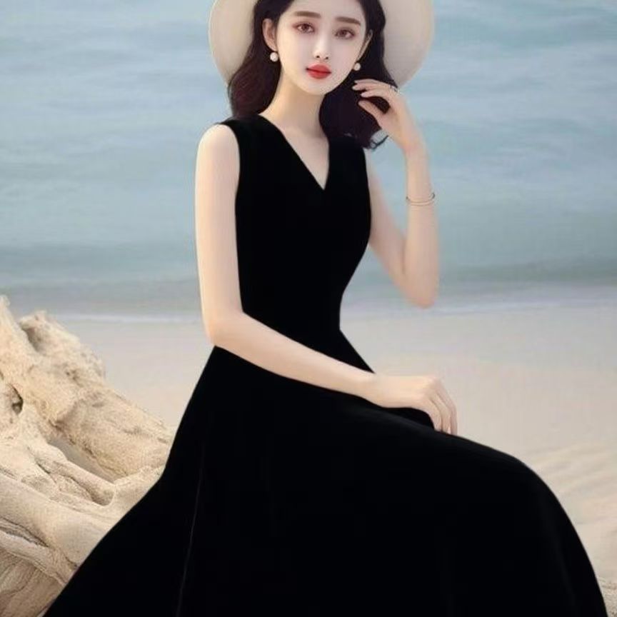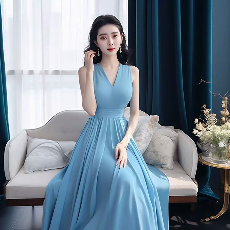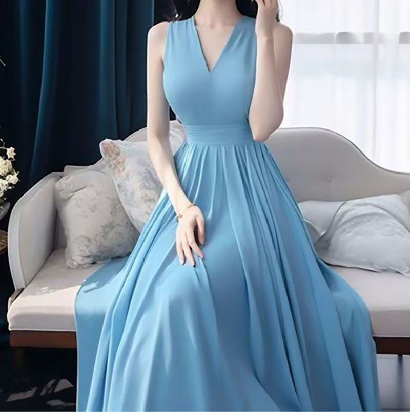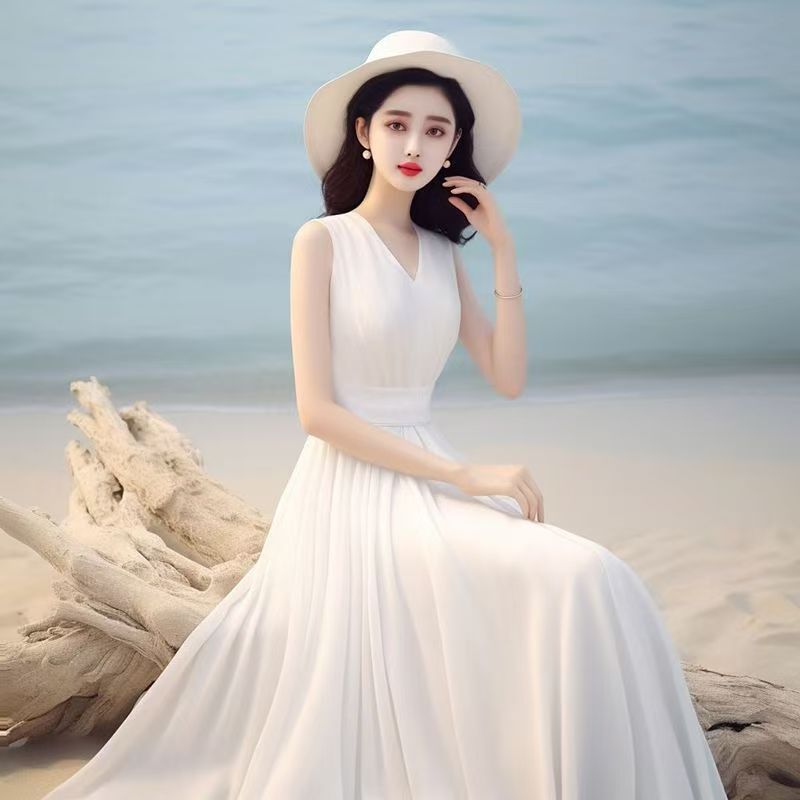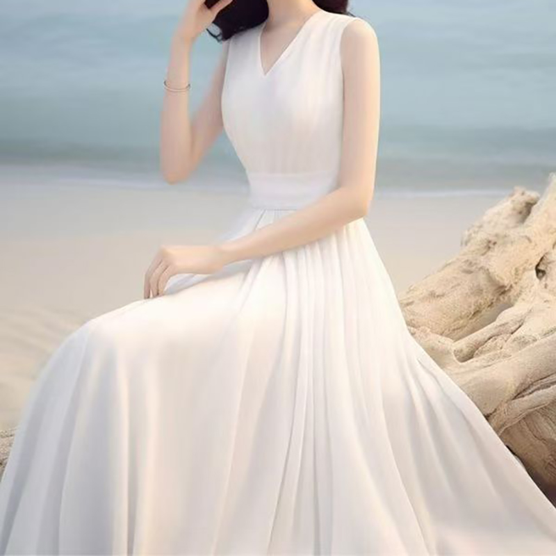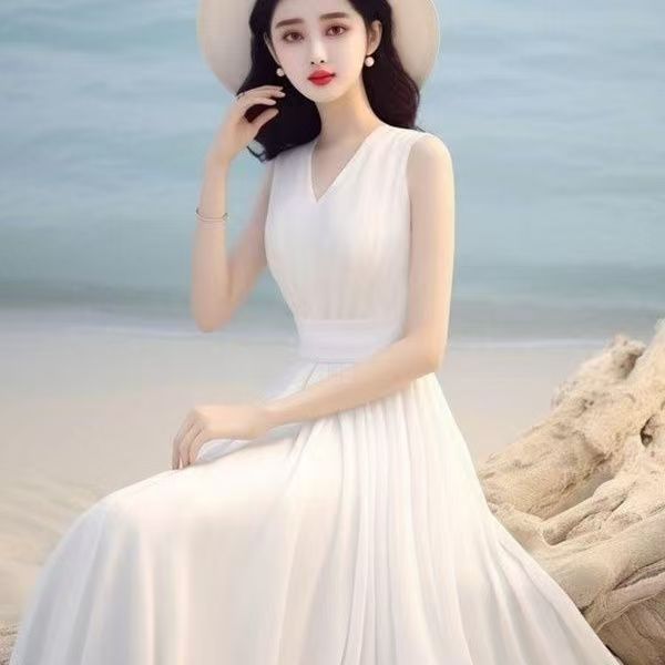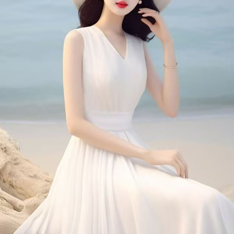 YF7466-(3色入内)韩版甜美时尚夏季无袖V领收腰高级感度假风白色雪纺连衣裙