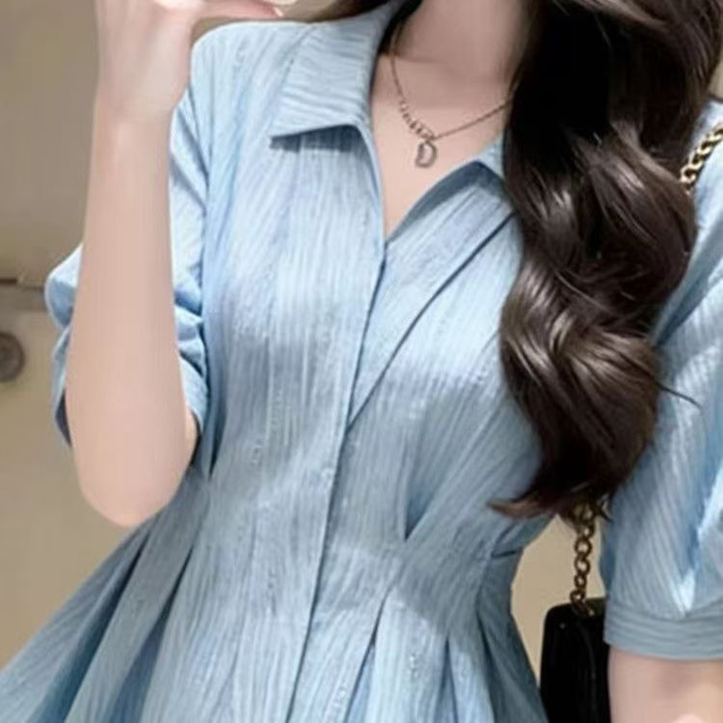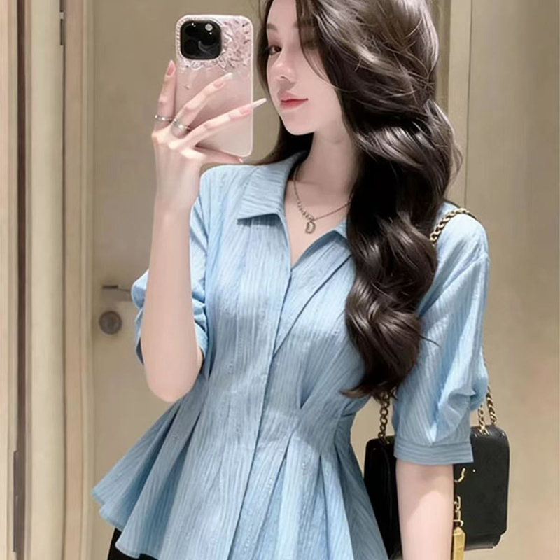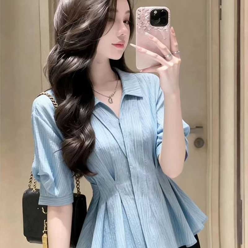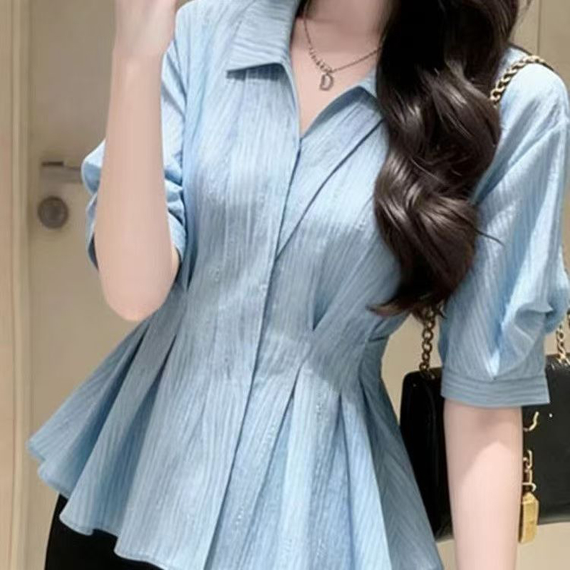 YF7475-图片色优雅时尚褶折修腰显瘦POLO领高级感夏季新款衬衣