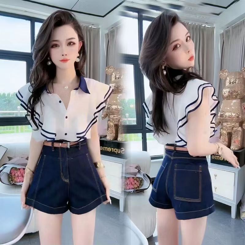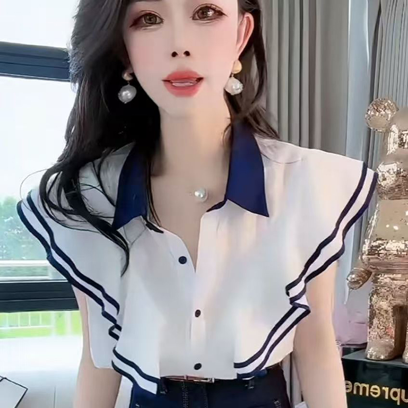 YF7479-图片色夏季波浪纹荷叶边撞色POLO领系扣宽松显瘦时尚设计雪纺衫