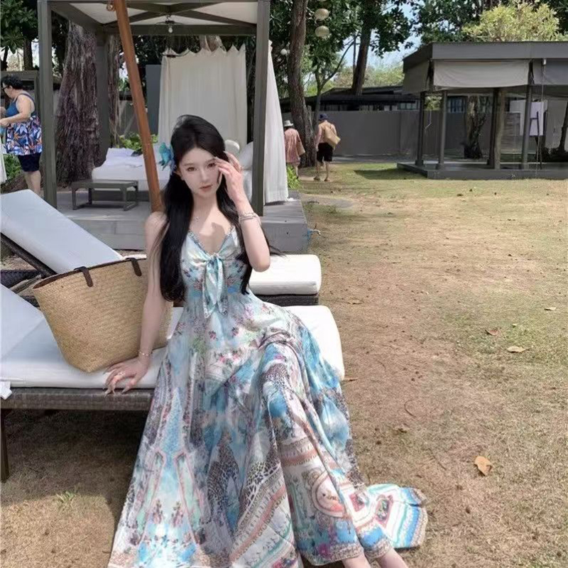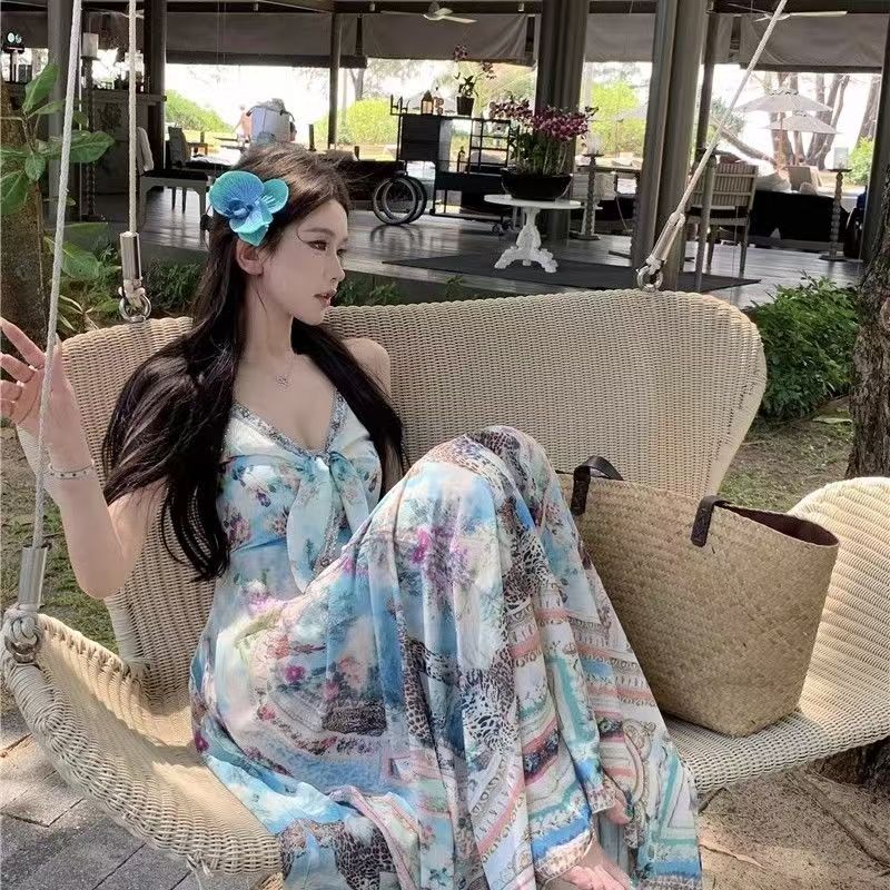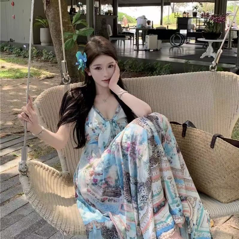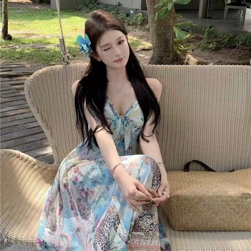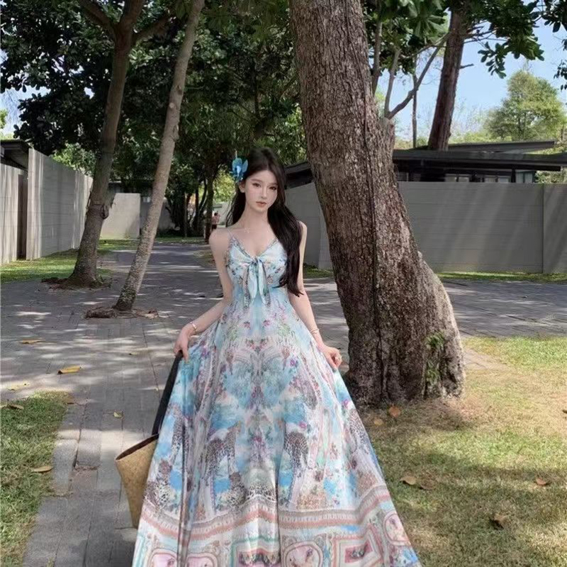 YF7482-图片色夏季度假风吊带系蝴蝶结小清新碎花A字大摆复古风连衣裙