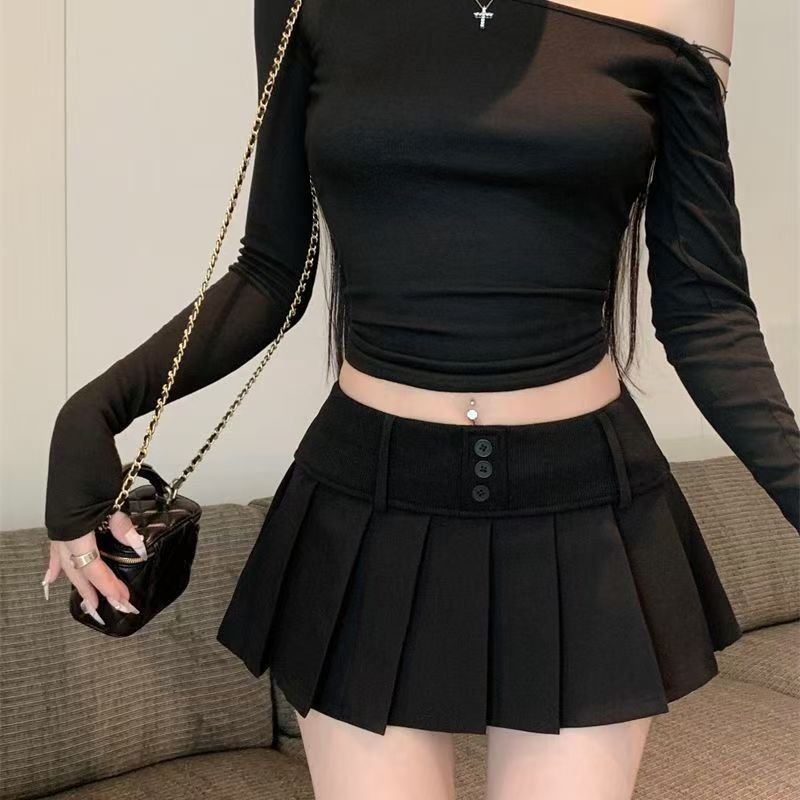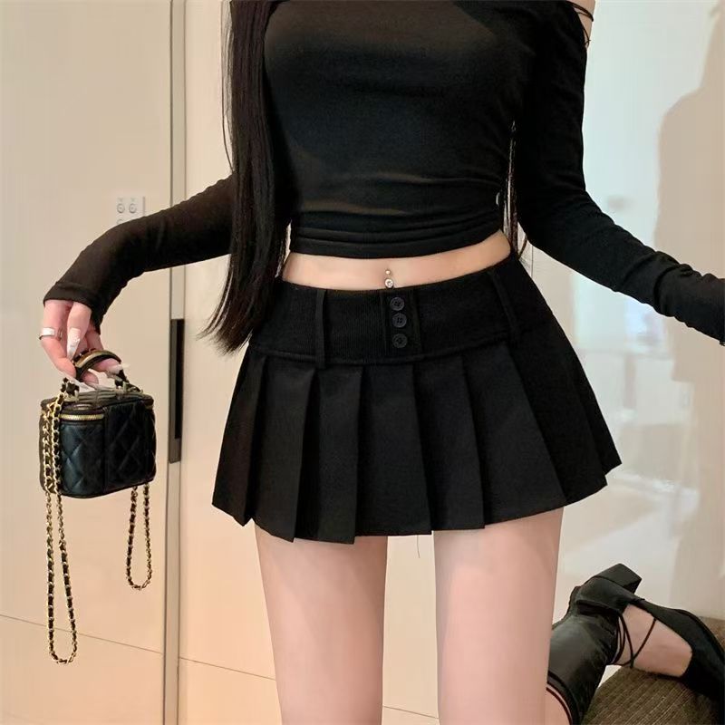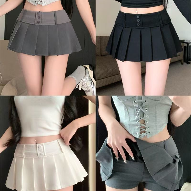 YF7488-(3色入内)时尚夏季三颗扣收腹高腰百褶防走光内衬辣妹A字短裙