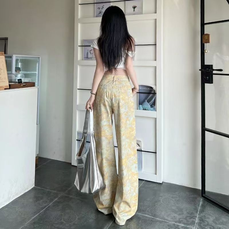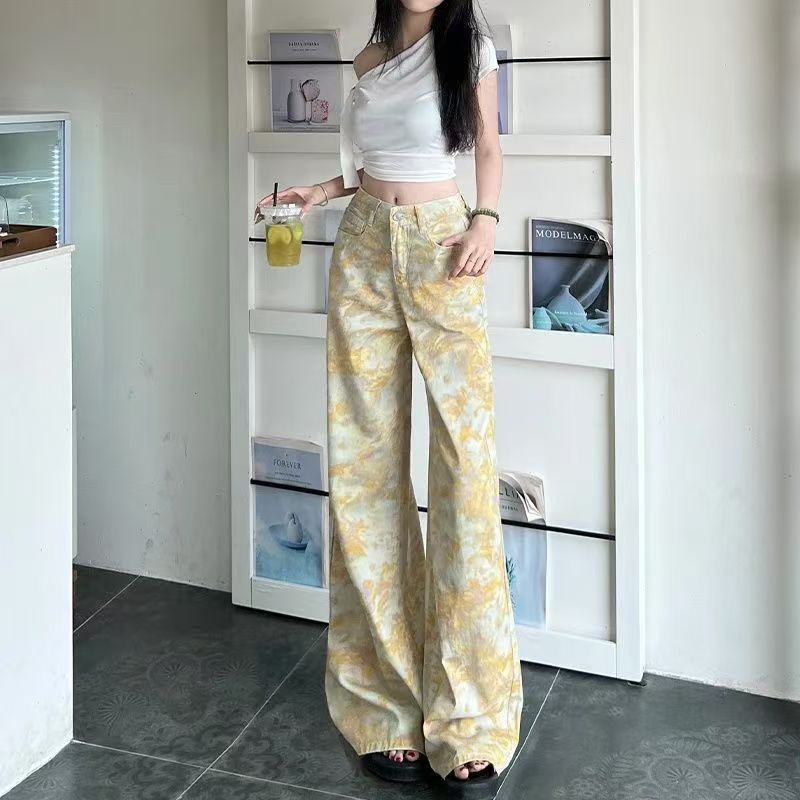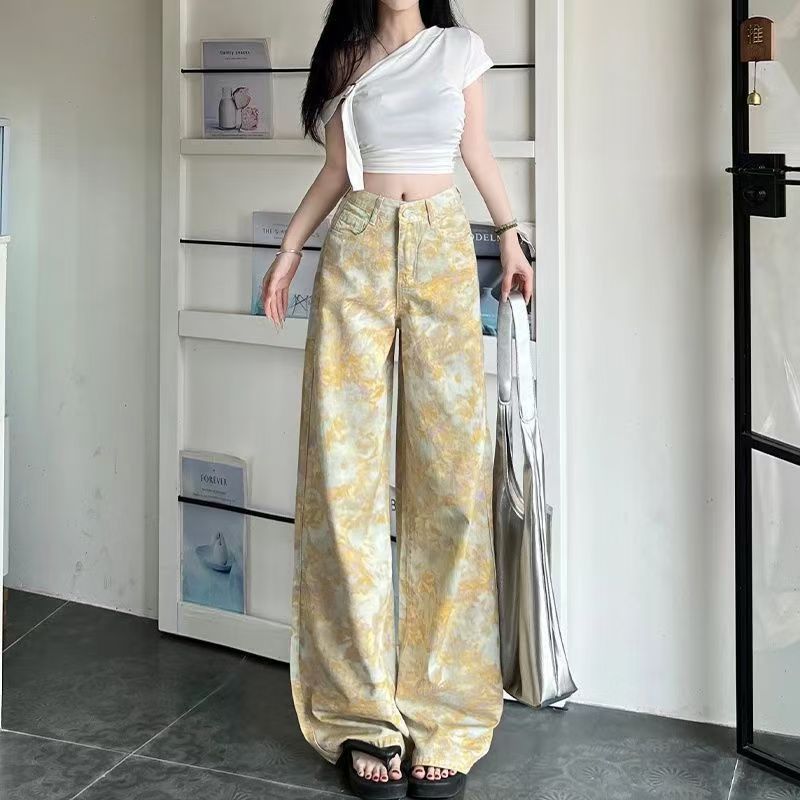 YF7489-图片色港式时尚扎染碎花高腰直筒坠地感慵懒风复古气质牛仔裤