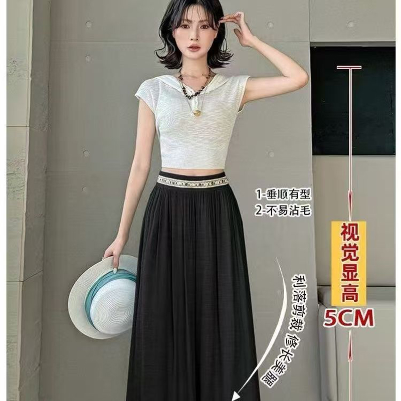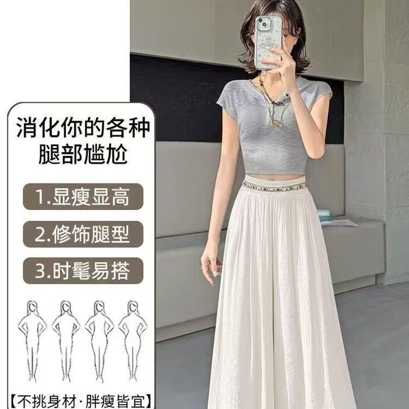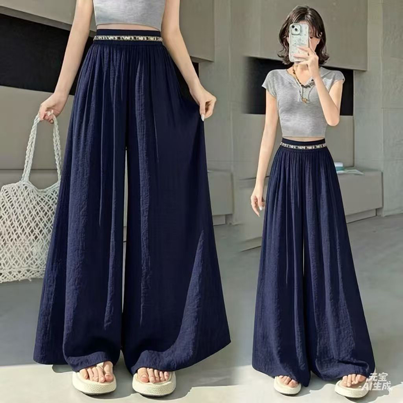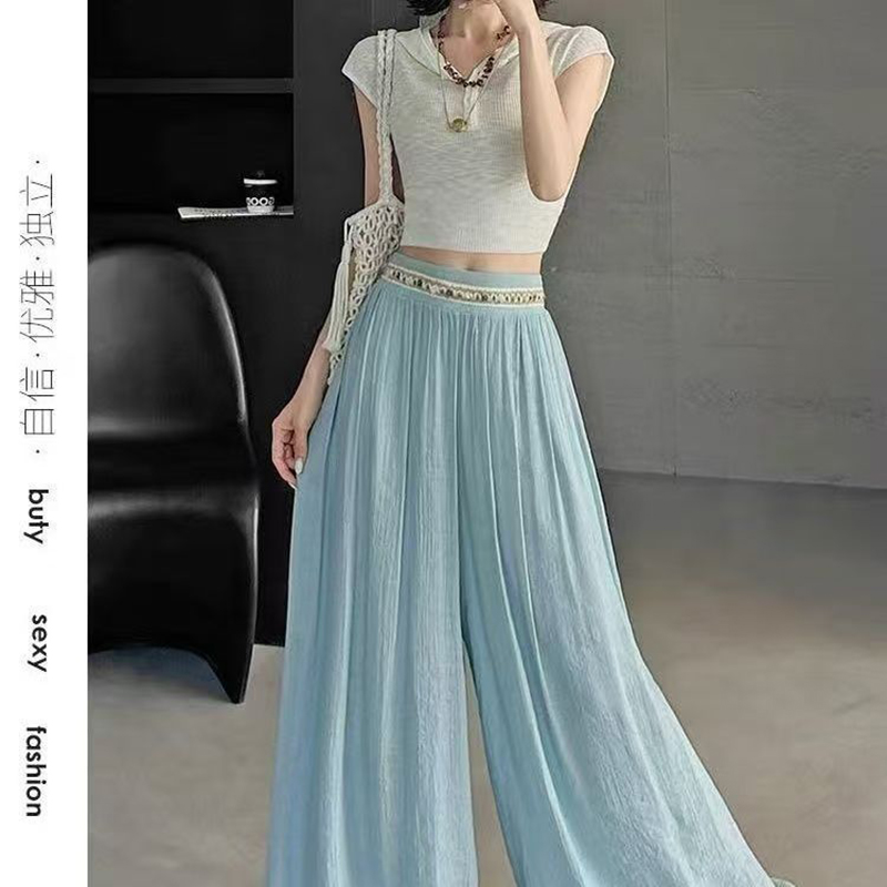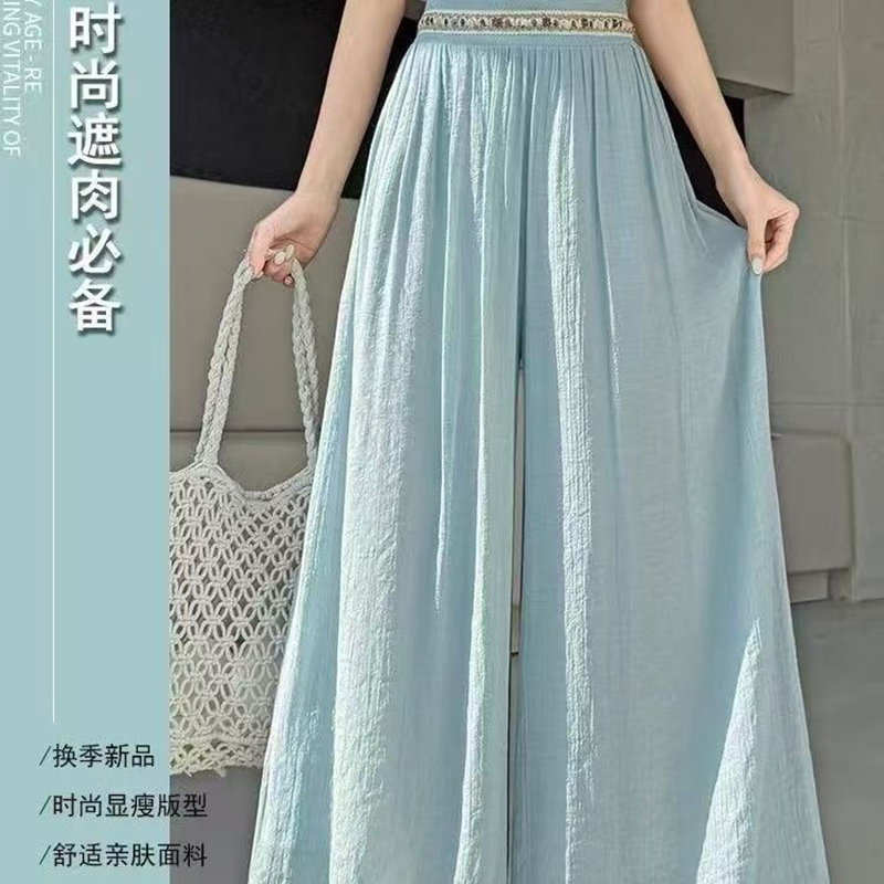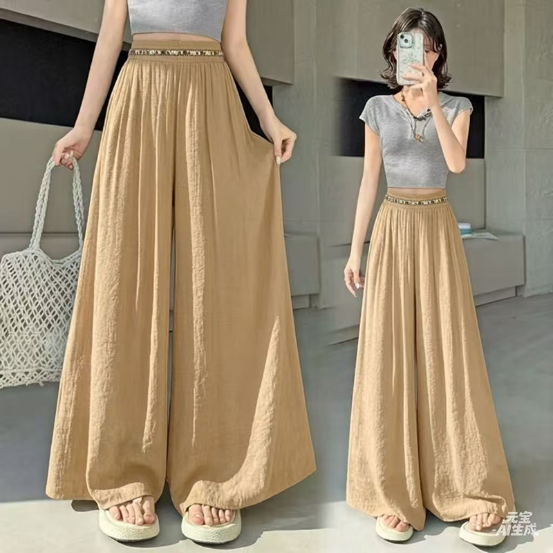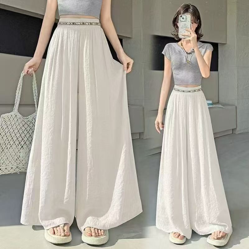 YF7490-(4色入内)韩版透气麻棉刺绣纤腰褶折直筒阔腿波西米亚坠地感休闲裤