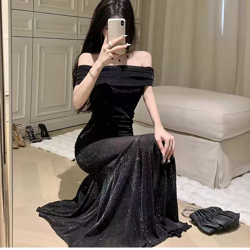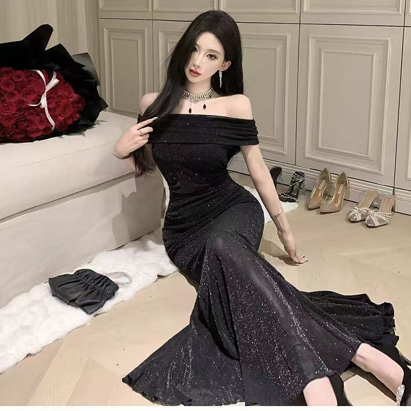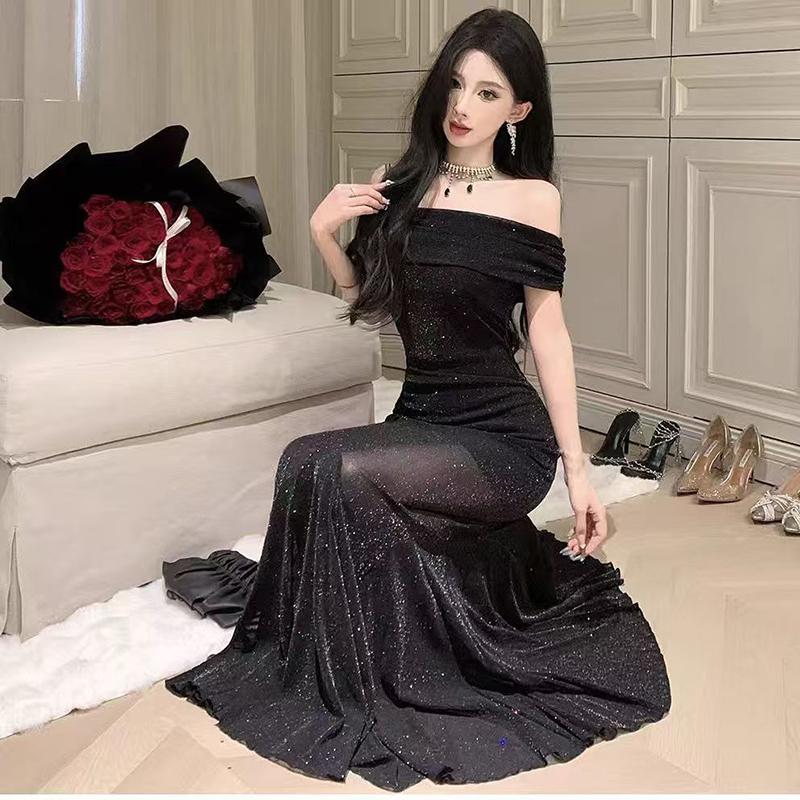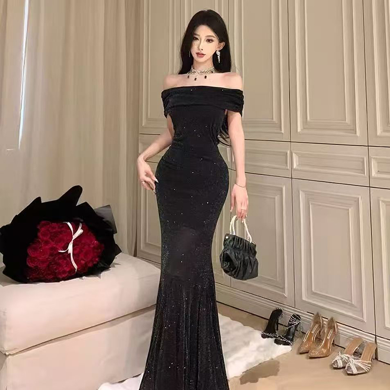YF7495--图片色名媛气质一字肩弹力修腰包臀鱼尾闪闪亮拖地鱼尾礼服连衣裙