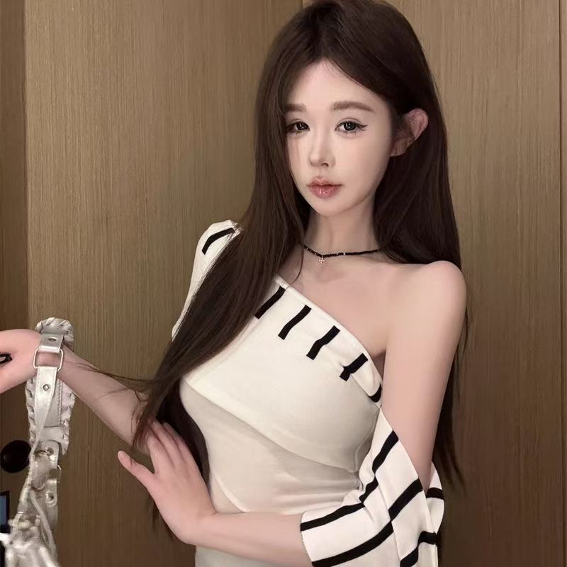 YF7500-图片色韩版纯欲风黑白纹一字肩飘带设计感弹力修腰复古显瘦上衣
