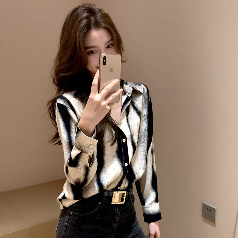 YF7506-图片色港式扎染水墨印花长袖翻领宽松显瘦慵懒风雪纺上衣