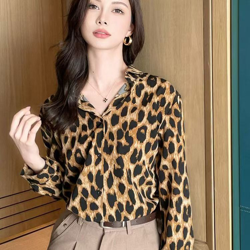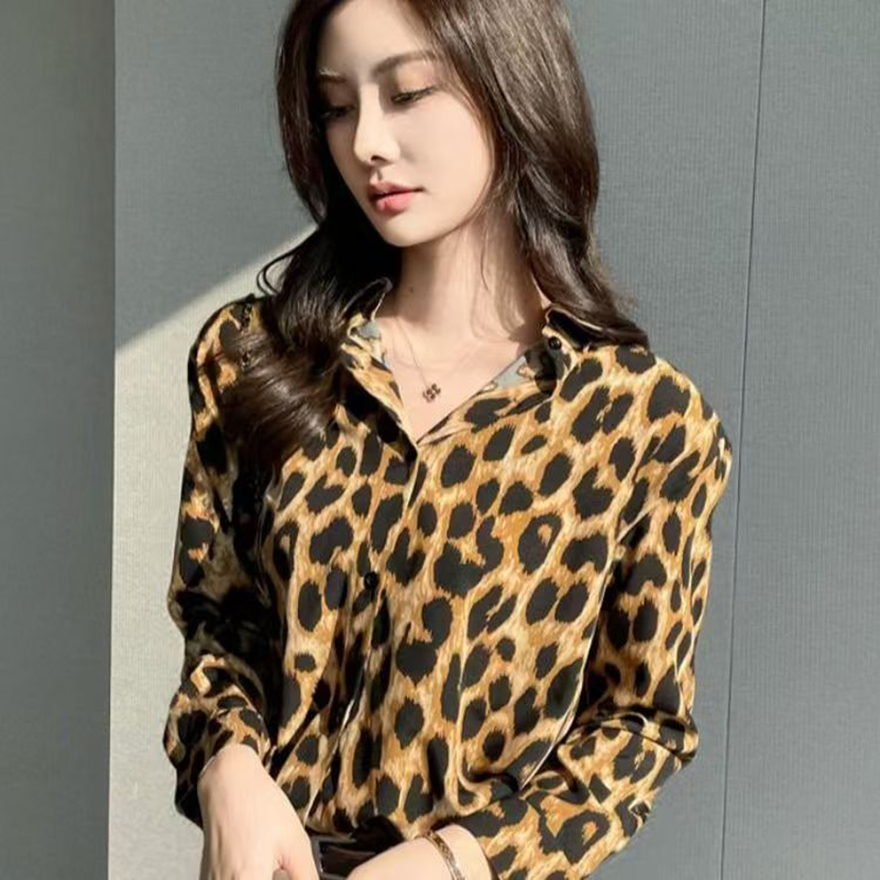 YF7509-(2色入内)性感辣妹新款豹纹印花长袖翻领宽松大码显瘦复古气质雪纺上衣