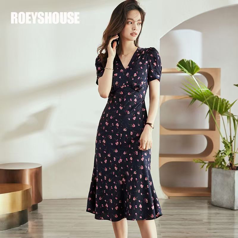 YF7512--图片色夏季简约碎花泡泡袖V领修腰鱼尾设计名媛风连衣裙